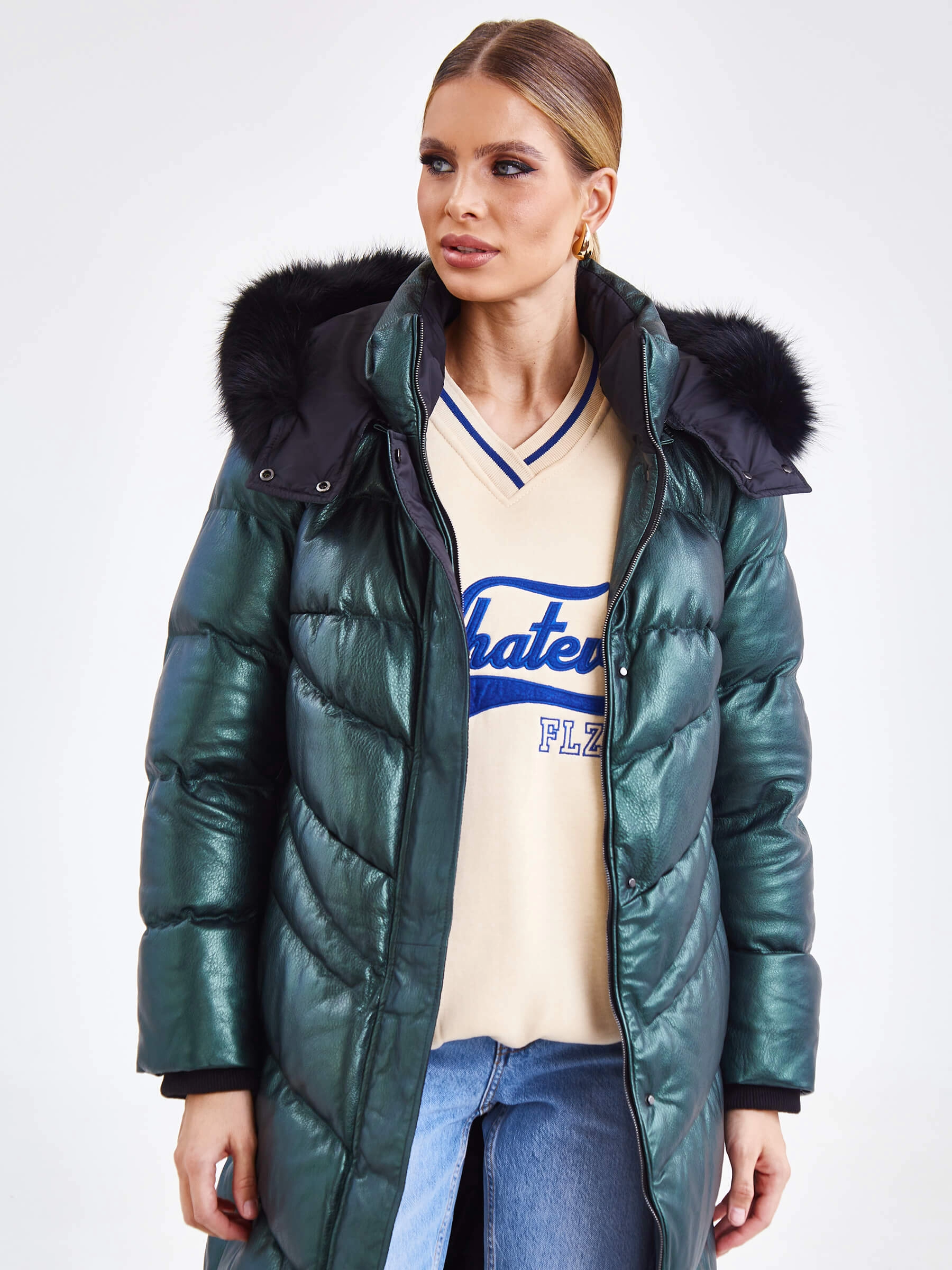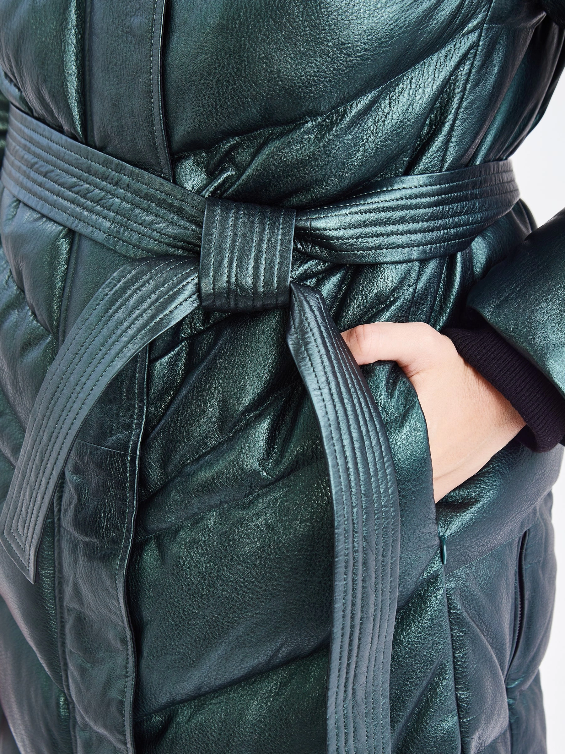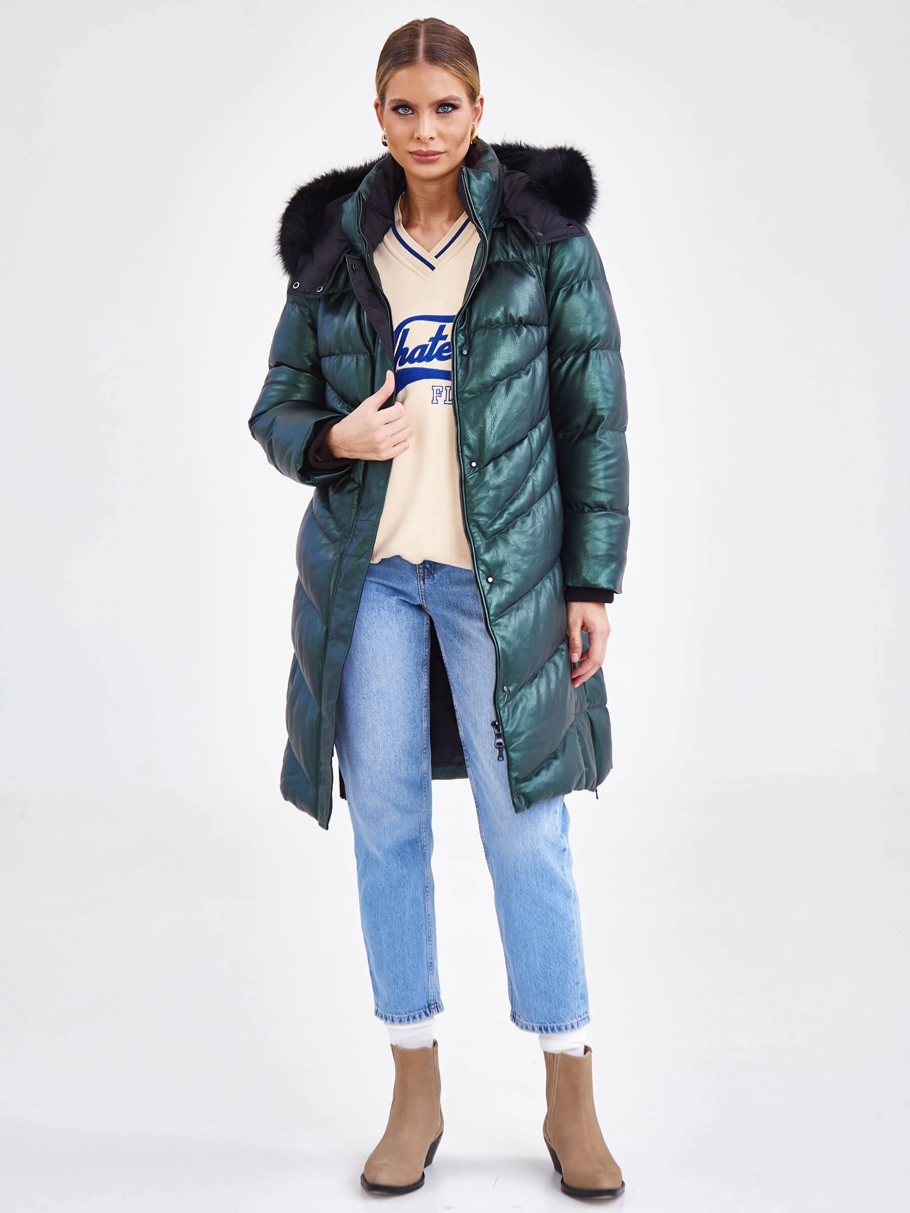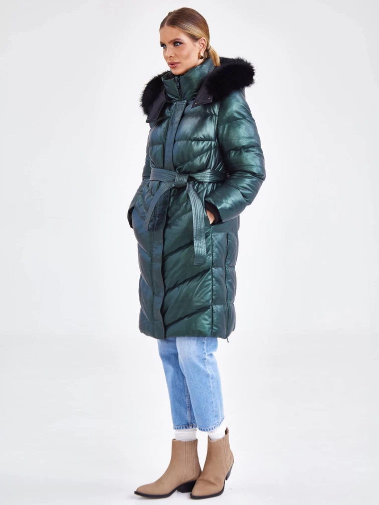 Товар женский кожаный пуховик с капюшоном премиум класса 3048, зеленый, размер 44, артикул 25450 выполнен из натуральной кожи с застежкой молния. Рассчитан на сезон: осень-зима. Длина изделия 97 см, силуэт прямой.