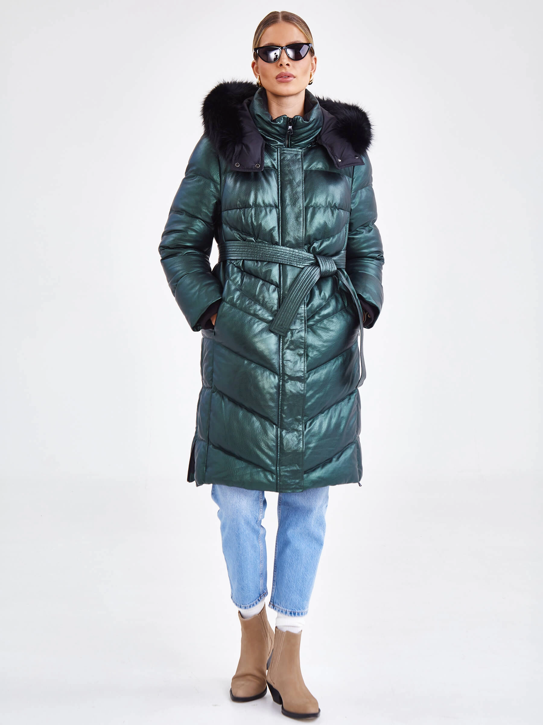 Что может быть удобнее в холодную погоду,чем легкий и теплый пуховик выполненный из мягкой натуральной кожи премиум класса. Прямой крой, воротник-стойка, два врезных кармана. Глубокий съемный капюшон декорированный пушистым мехом песца позволяет обойтись без головного убора. Дополнительный комфорт добавят плотные трикотажные манжеты. Боковые разрезы как и само изделие застегиваются молниями. Изменить силуэт поможет широкий пояс-лента.