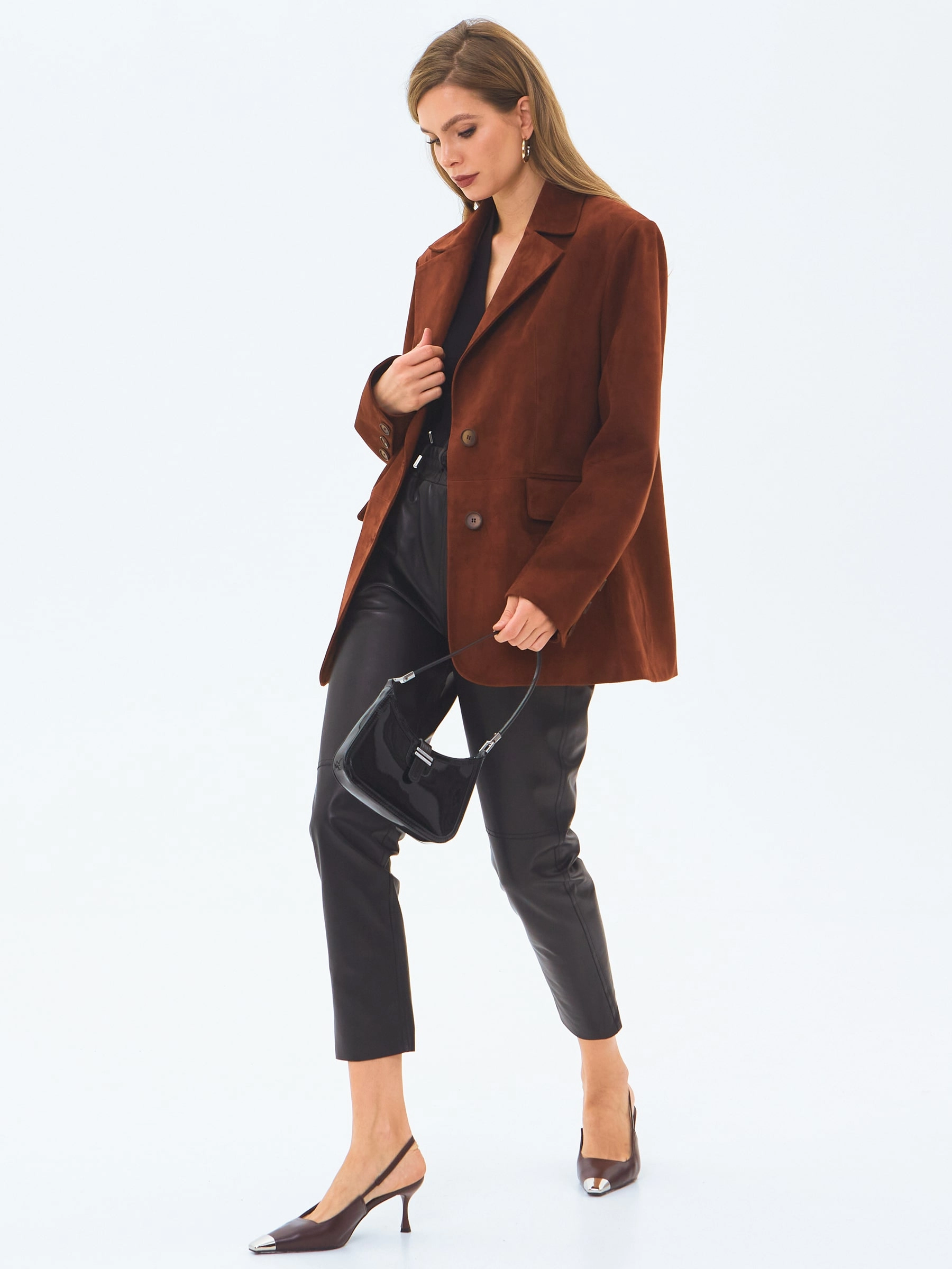 Классический пиджак с английским воротником и двумя боковыми карманами с клапанами выполнили из нежной замши. За счет бережной выделки, нежный материал с бархатистой фактурой, позволил создать легкую, комфортную модель. Для дополнительной свободы движения сзади предусмотрели шлицу. Изделие застегивается двумя пуговицами.