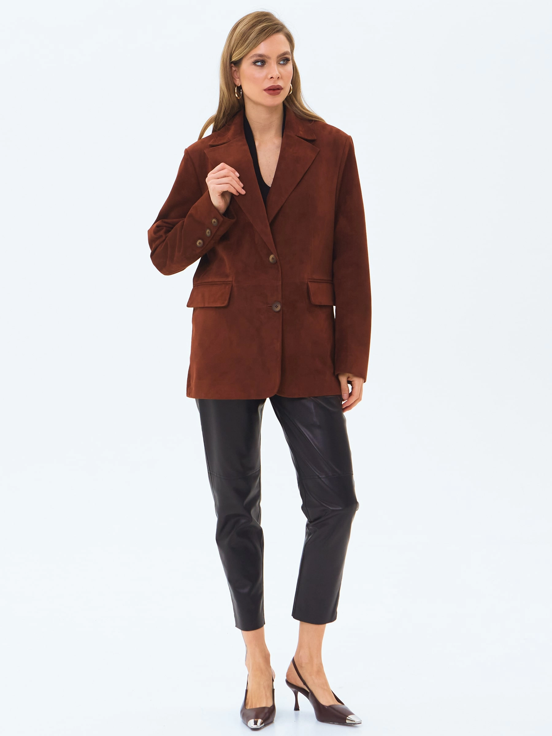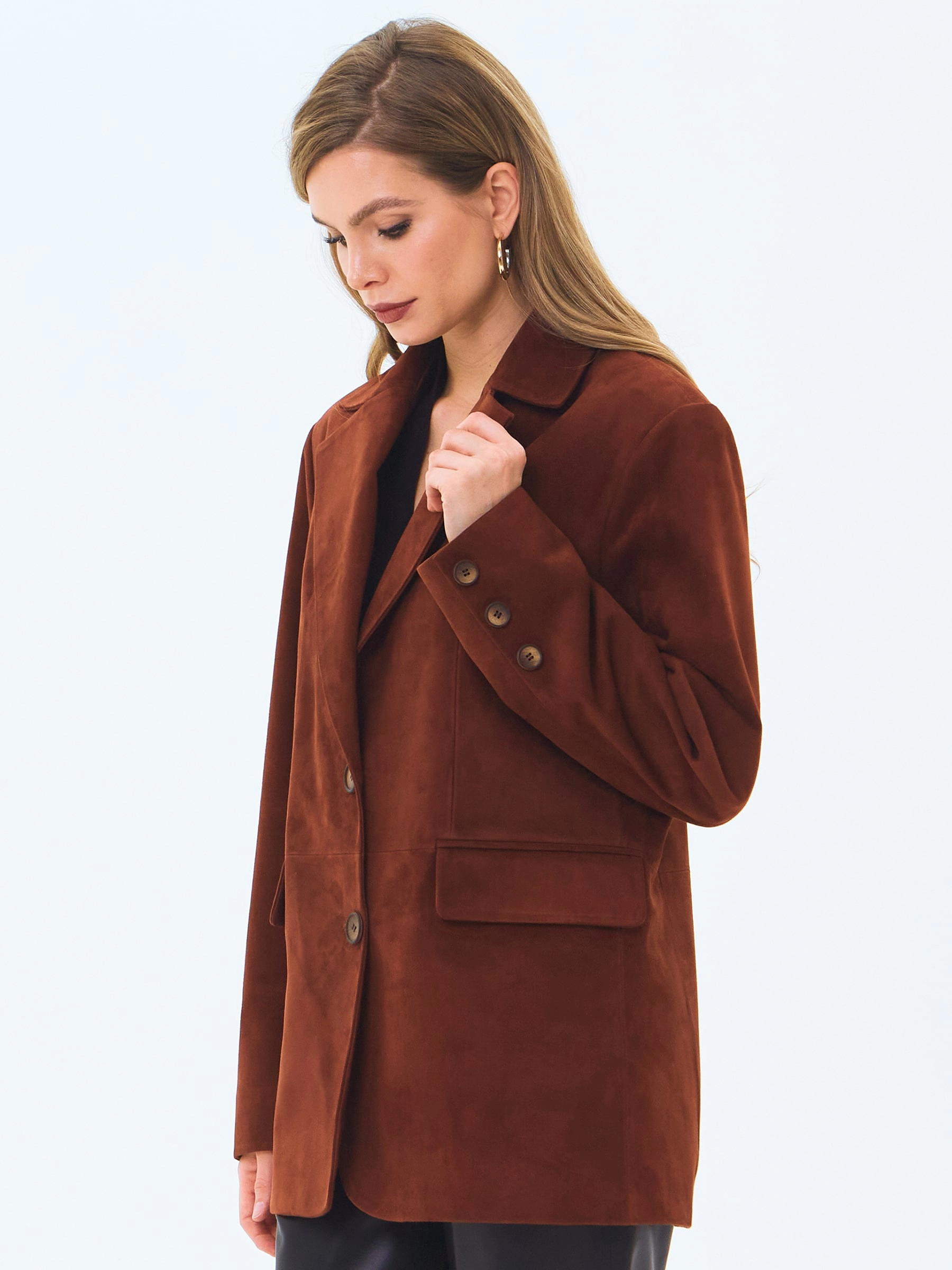 Товар женский замшевый пиджак премиум класса 3096з, табачный, размер 48, артикул 24370 выполнен из натуральной замши с застежкой пуговицы. Рассчитан на сезон: весна-лето. Длина изделия 75 см, силуэт полуприлегающий.