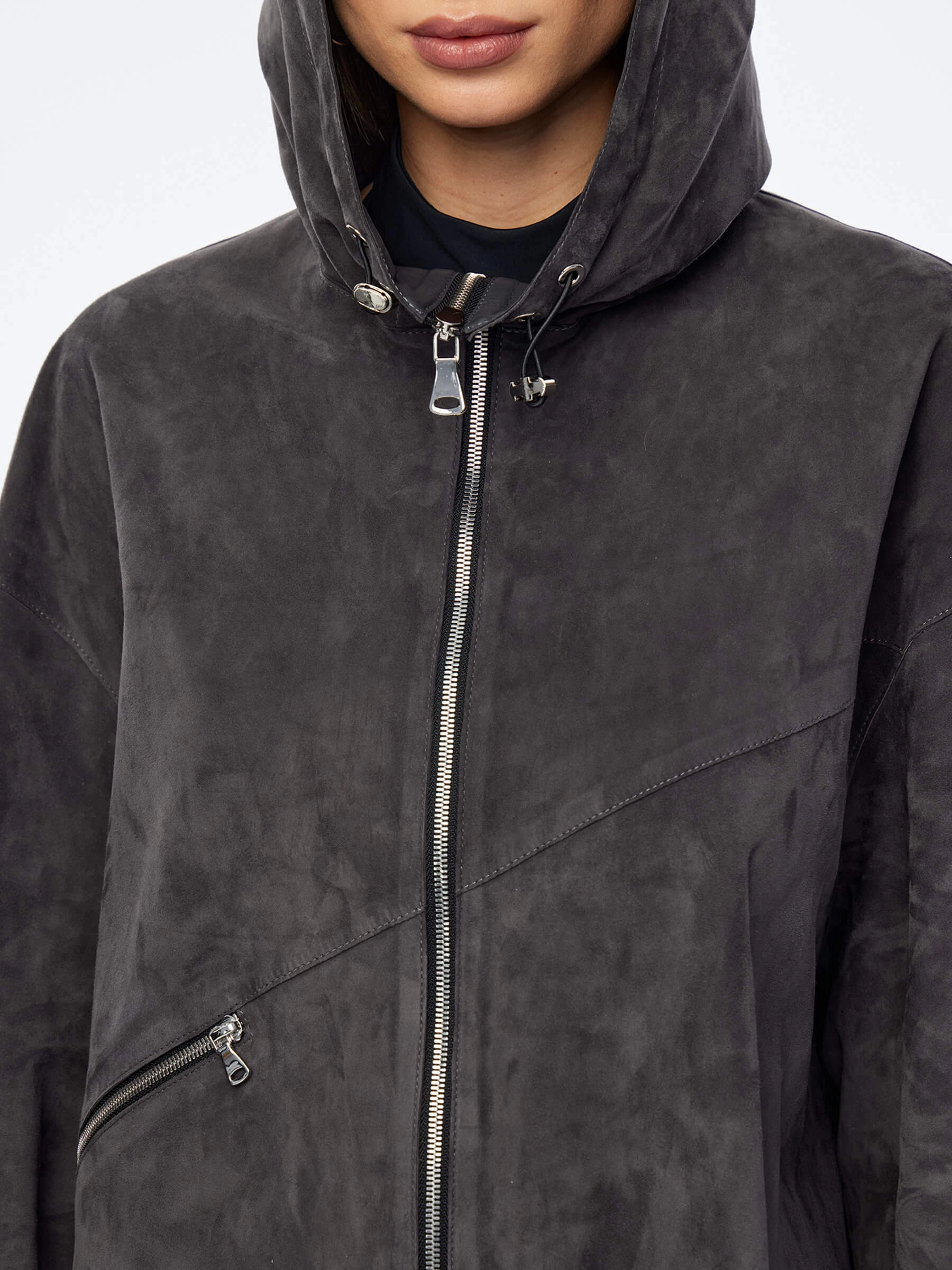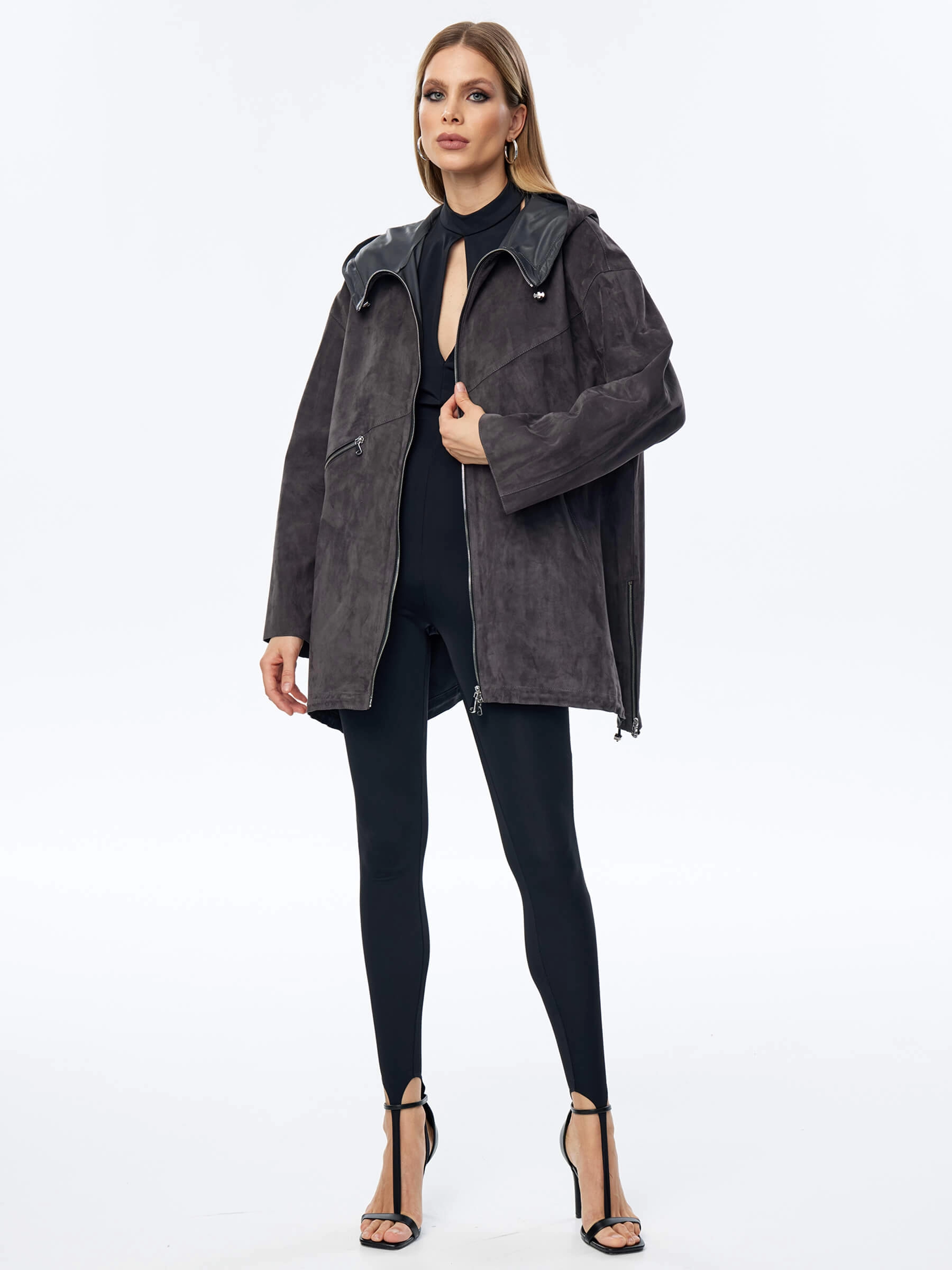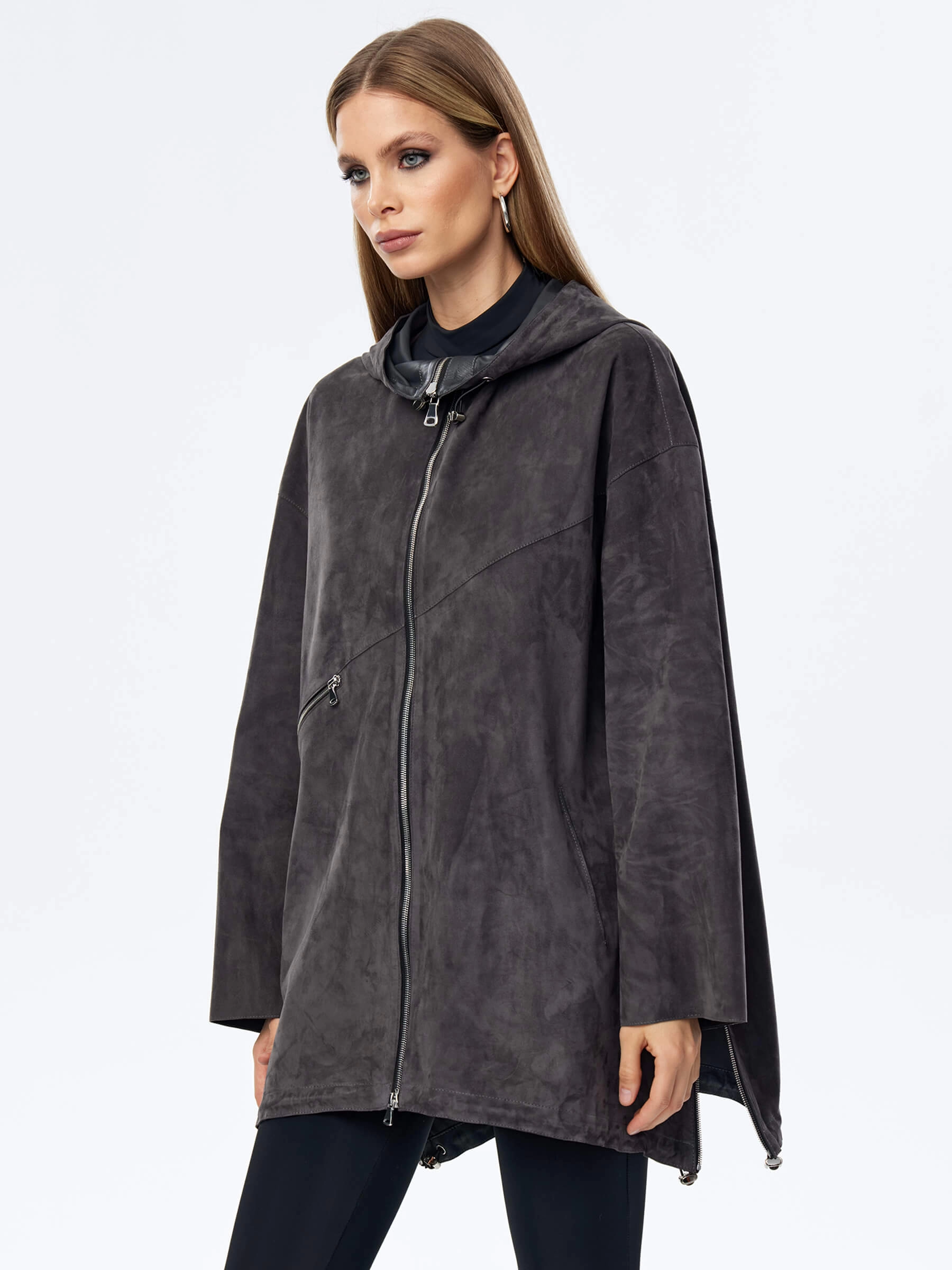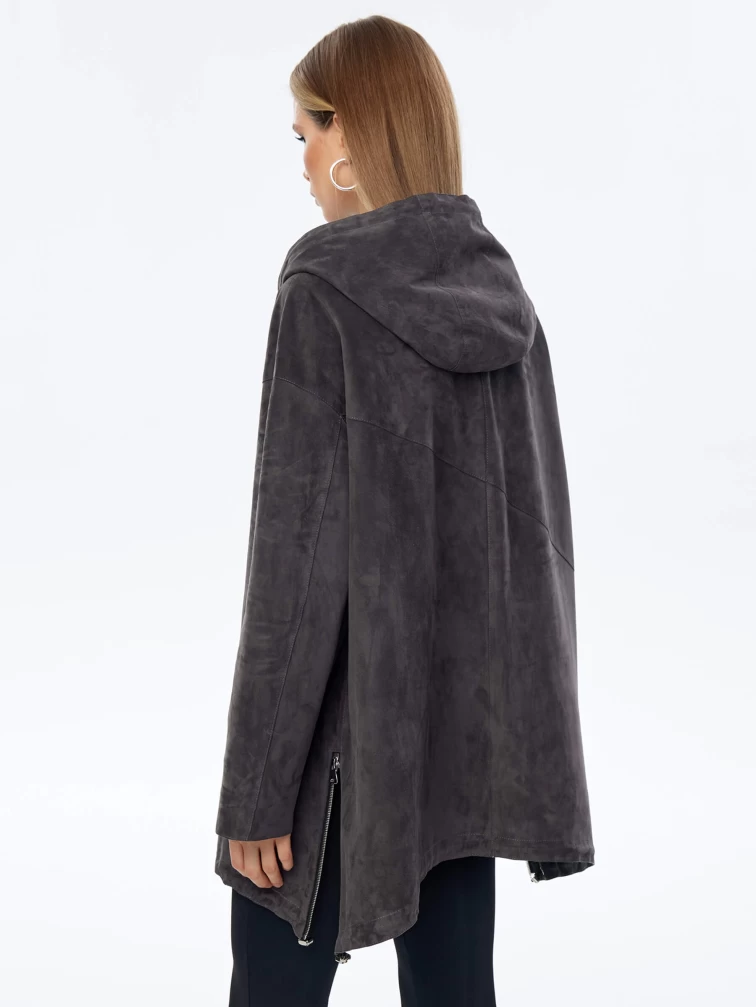 Для пошива модели с регулируемыми глубоким капюшоном и низом, мастера использовали нежную бархатистую замшу премиум класса. Свободный крой, два врезных кармана, боковые разрезы как и сама модель застегиваются крупными серебристыми молниями. Роль декора отдали асиммитричному карману.