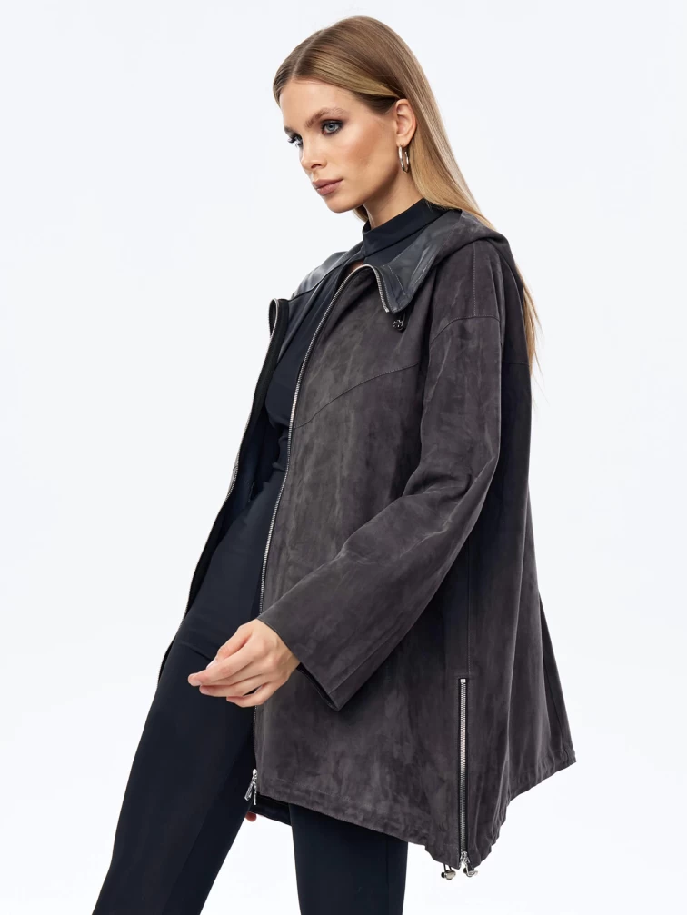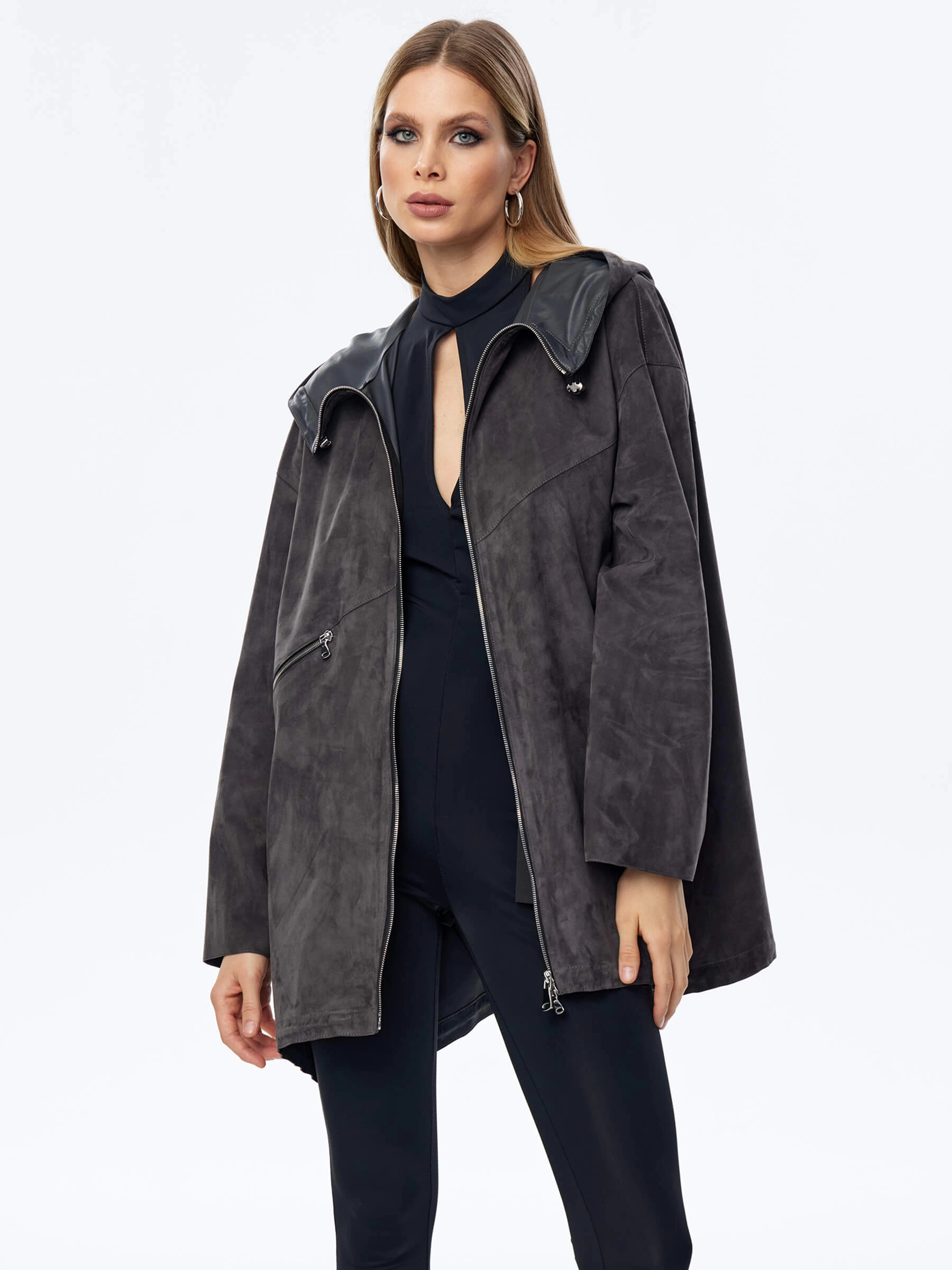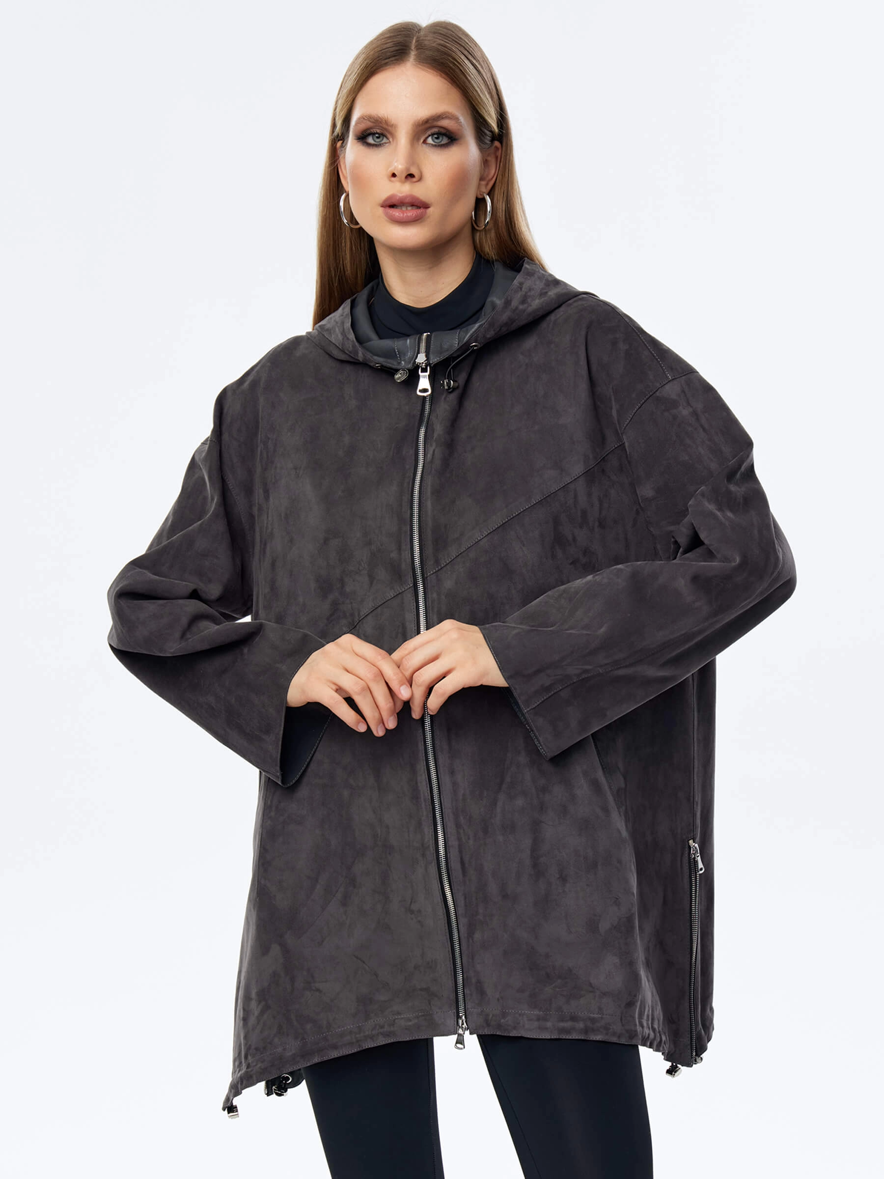 Товар замшевый плащ оверсайз с капюшоном для женщин премиум класса 3053з, темно-серый, размер 54, артикул 23990 выполнен из натуральной замши с застежкой молния. Рассчитан на сезон: весна-лето. Длина изделия 75 см, силуэт оверсайз.