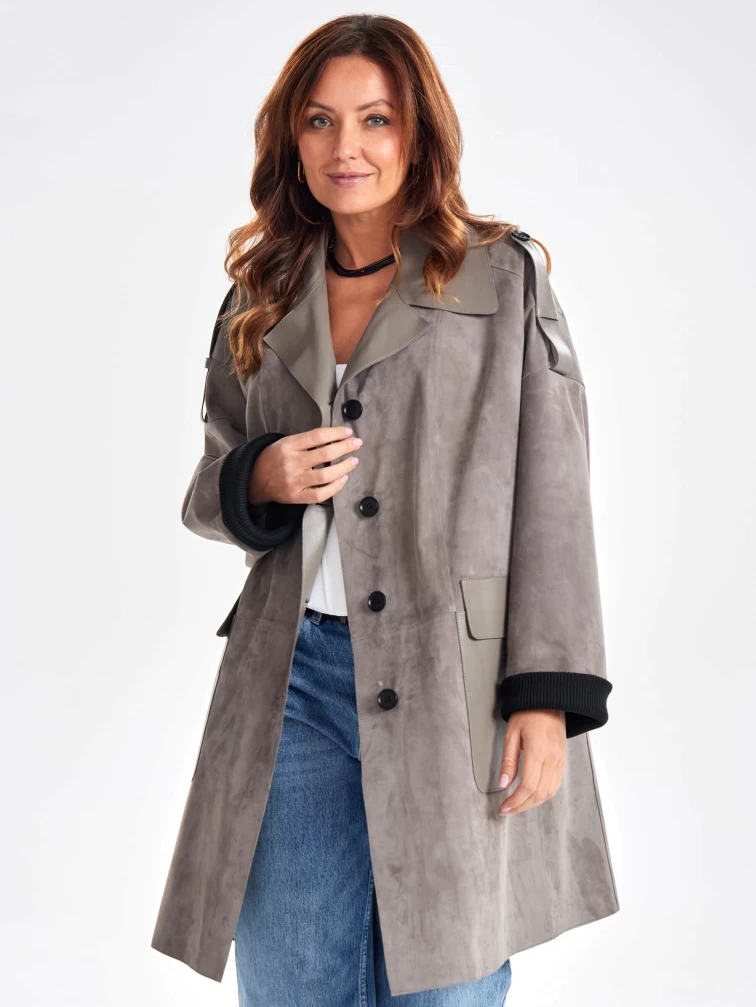 Товар женское короткое замшевое полупальто оверсайз премиум класса 3063з, серое, размер 48, артикул 64060 выполнен из натуральной замши с застежкой пуговицы. Рассчитан на сезон: весна-лето. Длина изделия 93 см, силуэт свободный.