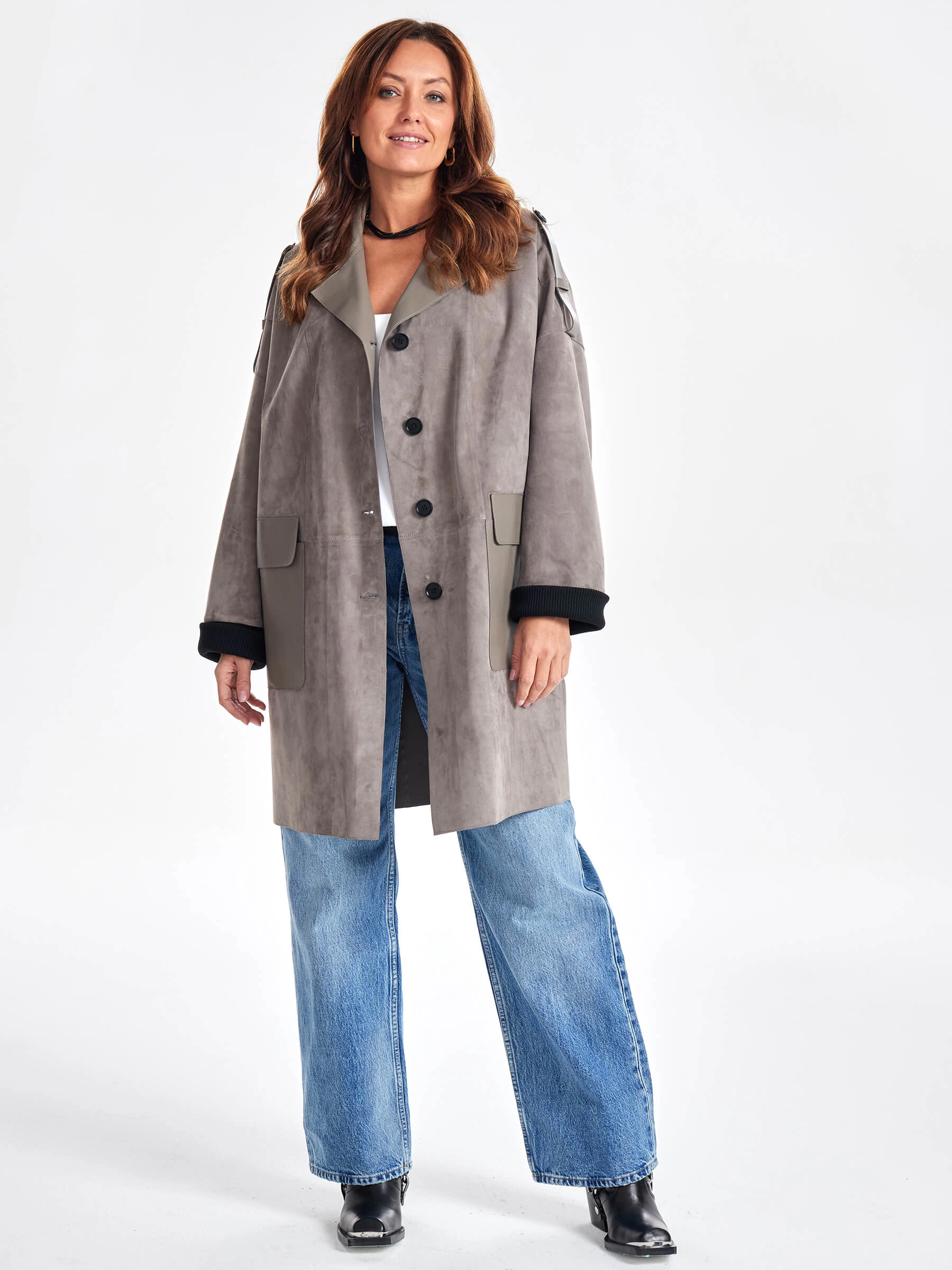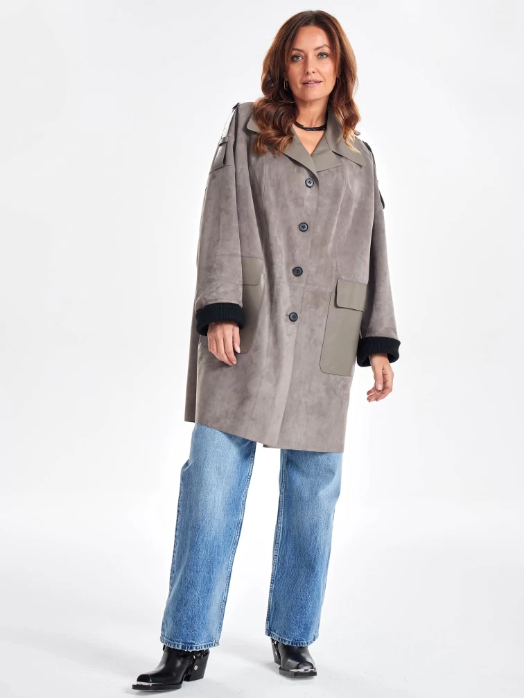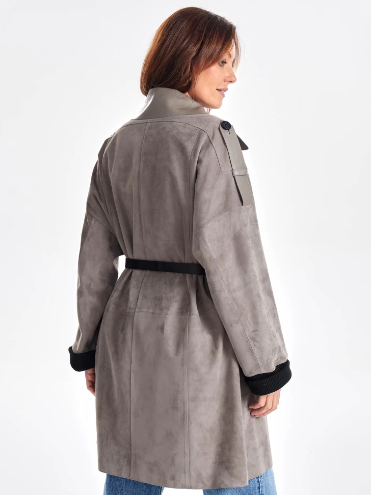 Стиль и комфорт читается в этом полупальто. Для пошива изделия использовали бархатистую нежную замшу тонкой выделки. Свободный силуэт изделия удобно садится по фигуре. Английский воротник и спущенная линия плеч. Посадку по фигуре можно регулировать узким поясом. Акцент сделали на погоны и крупные накладные карманы в гладкой кожи.