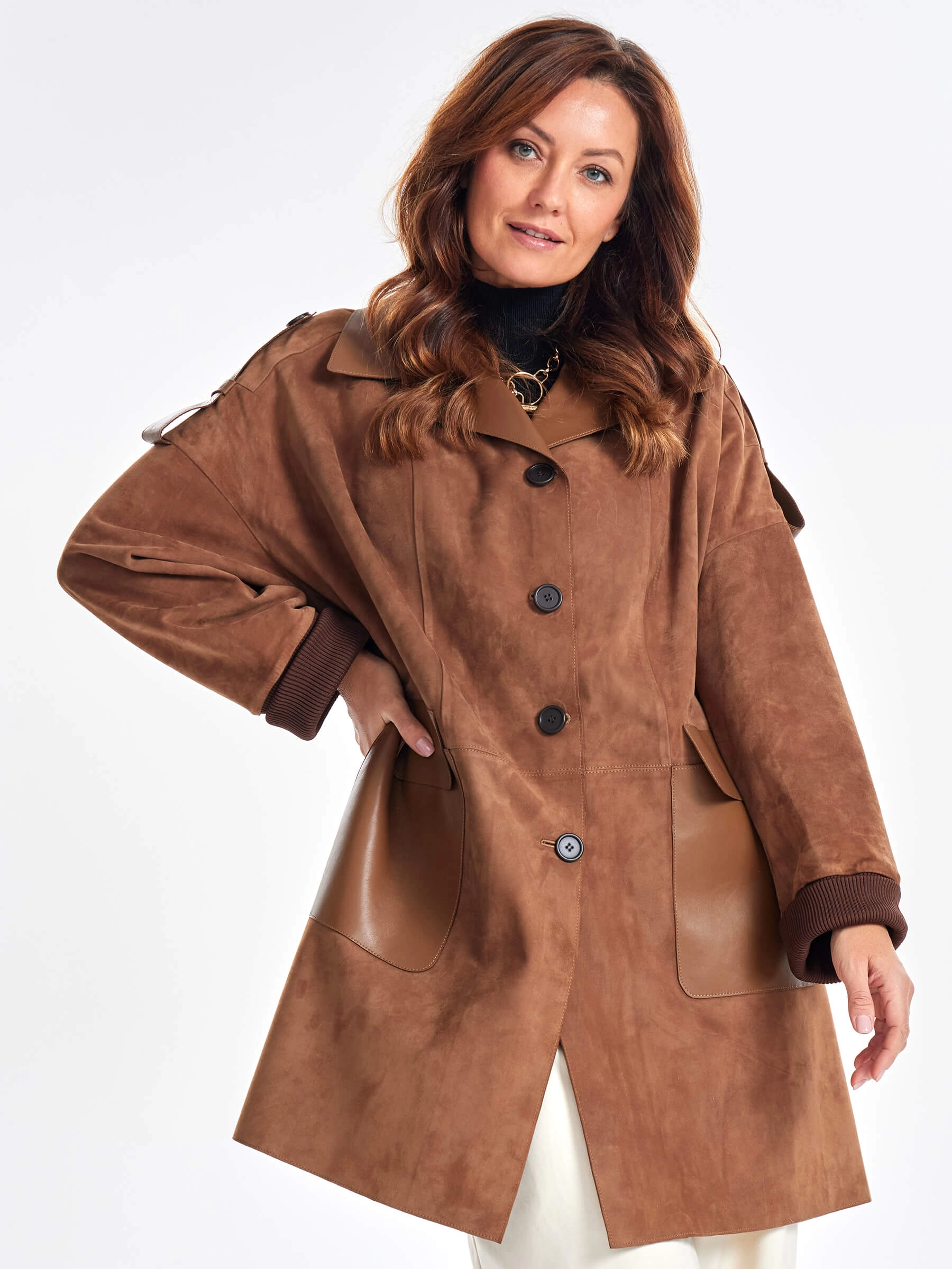 Стиль и комфорт читается в этом полупальто. Для пошива изделия использовали бархатистую нежную замшу тонкой выделки. Свободный силуэт изделия удобно садится по фигуре. Английский воротник и спущенная линия плеч. Посадку по фигуре можно регулировать узким поясом. Акцент сделали на погоны и крупные накладные карманы в гладкой кожи.