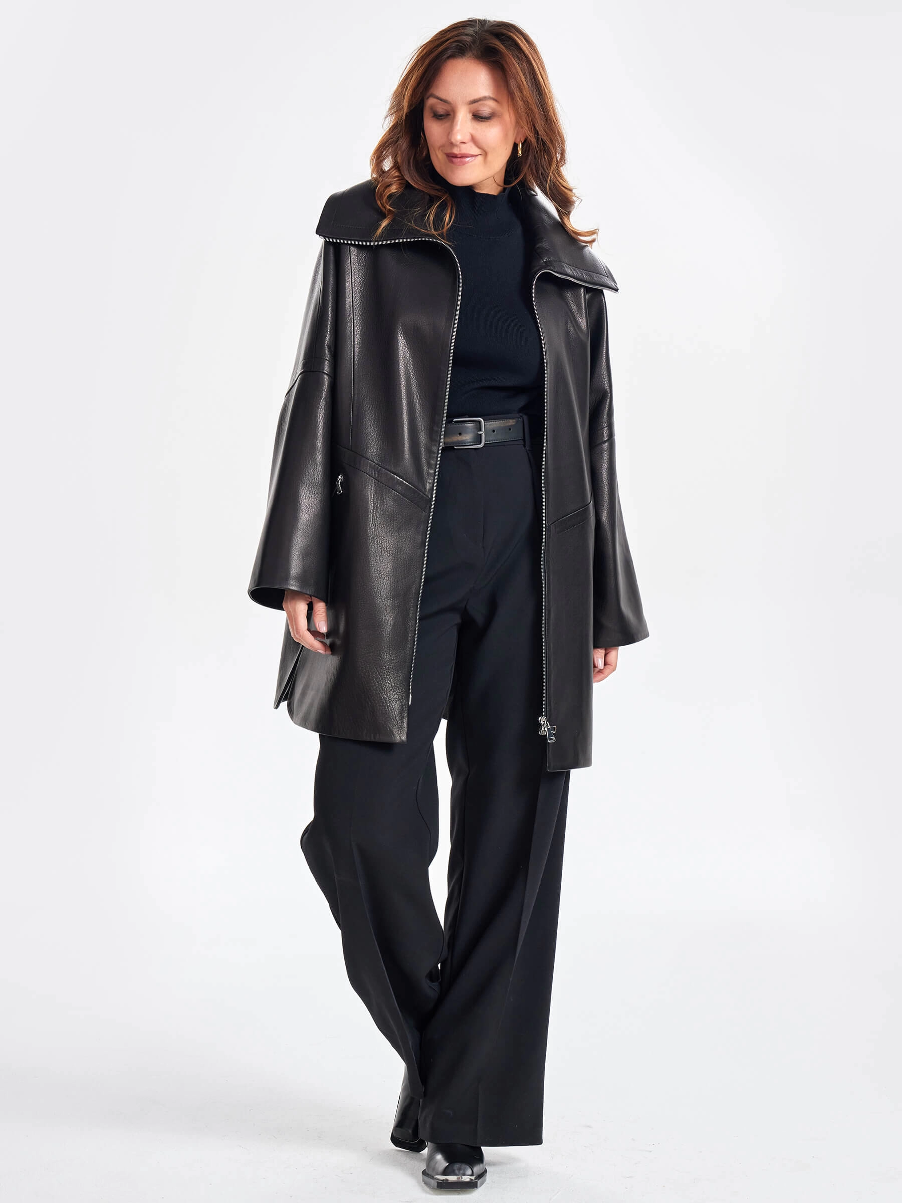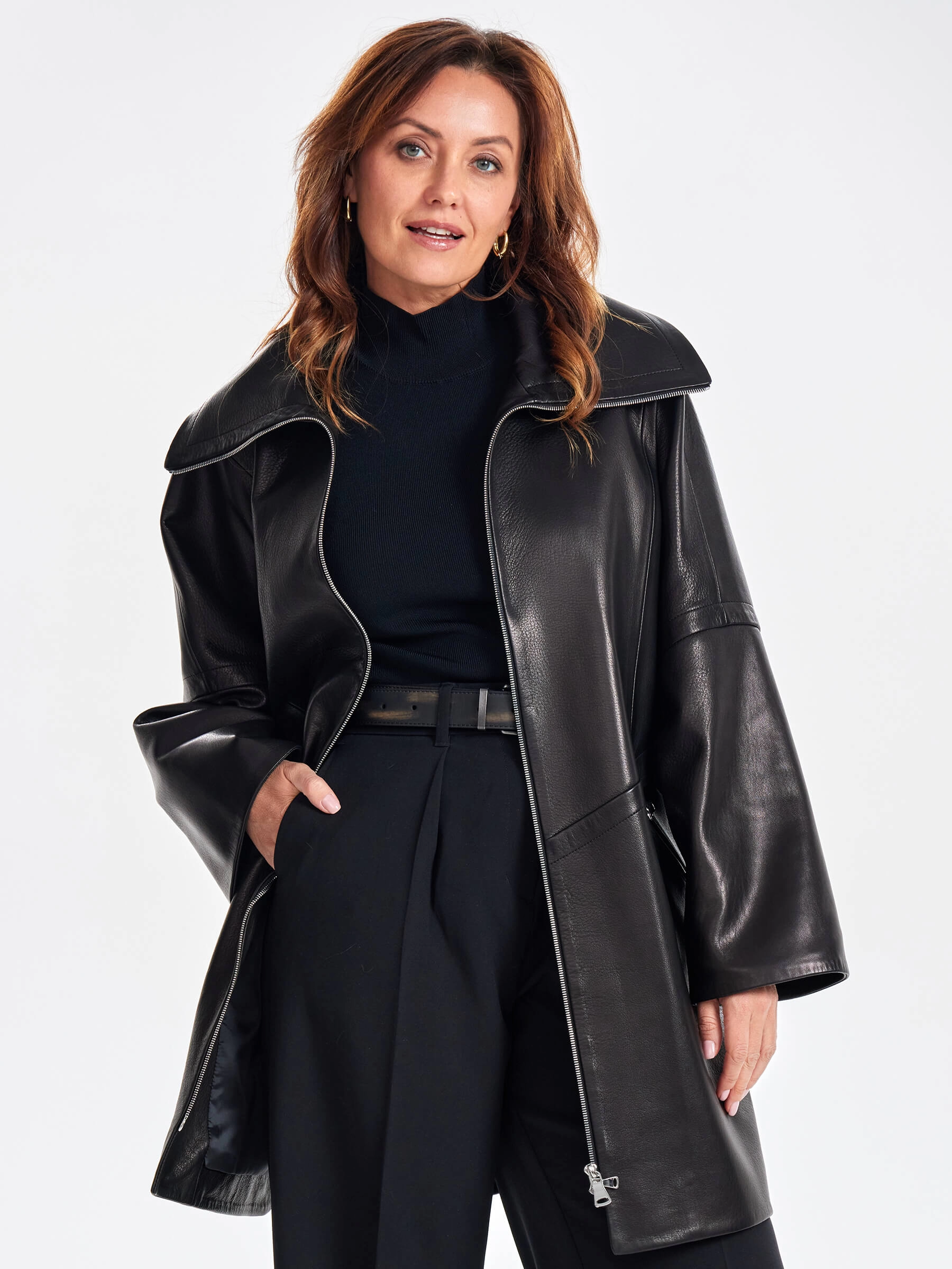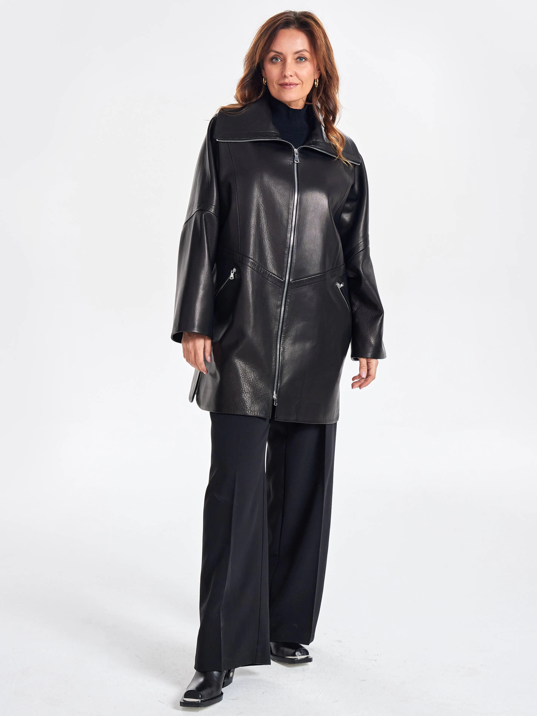 Это кожаное полупальто оверсайз на молнии для женщин премиум-класса мастера выполнили для дам, которые привыкли ценить безупречный стиль и абсолютный комфорт в одежде в весенне-осенний сезон. Для пошива модели, застегивающейся на встречную молнию, использовали фактурную мягкую кожу премиум-класса с благородной матовой поверхностью, которая подчеркивает статусность и долговечность изделия. Свободный крой оверсайз со спущенной линией плеч и длиной 87 см удобно садится по фигуре, создавая расслабленный и актуальный силуэт, который дарит полную свободу движений. Рукав регулируется широким манжетом, позволяя адаптировать посадку под индивидуальные предпочтения. Лаконичный воротник-стойка станет надежной защитой в ветреную погоду, а для большей свободы движения предусмотрены боковые разрезы, которые добавляют модели динамики и комфорта при ходьбе. Совет стилиста: благодаря универсальному крою оверсайз это полупальто станет идеальной базой для многослойных образов — носите его с объемными свитерами, узкими брюками и