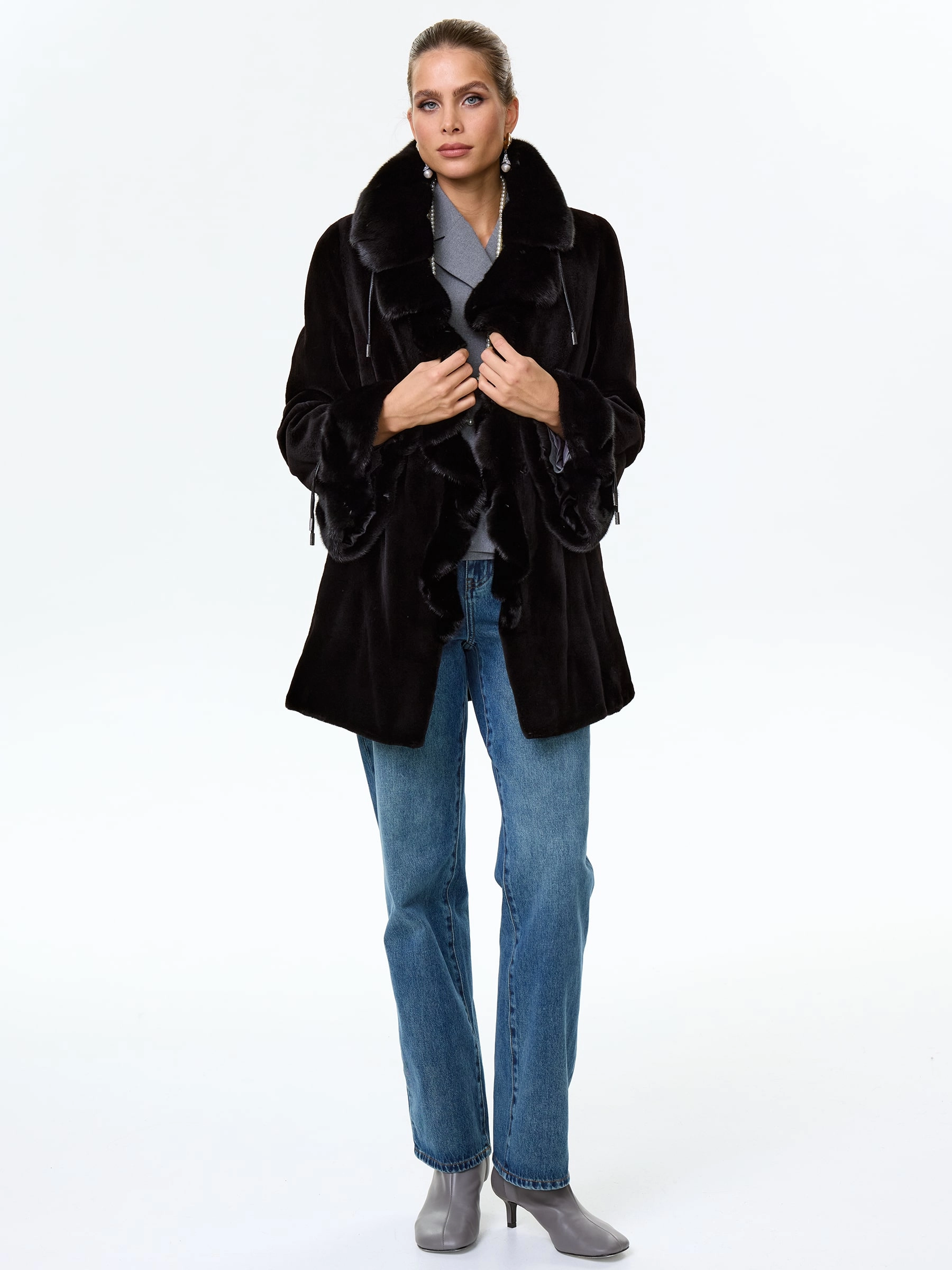Для пошива этого полупальто использовали бархатистый щипаный мех норки в тандеме с низковорсовой, которой подчеркнули детали изделия. Прямой крой, комфортная посадка по фигуре. Шалевидный воротник и манжеты регулируются кулисками. Застежка-клипсы.