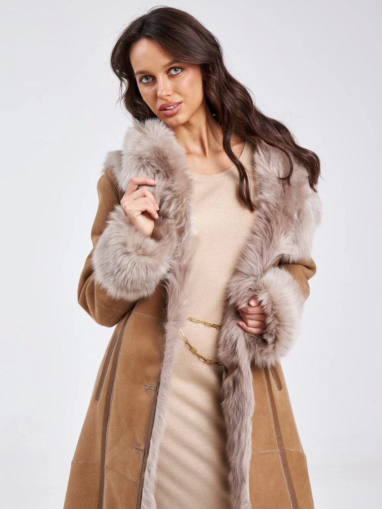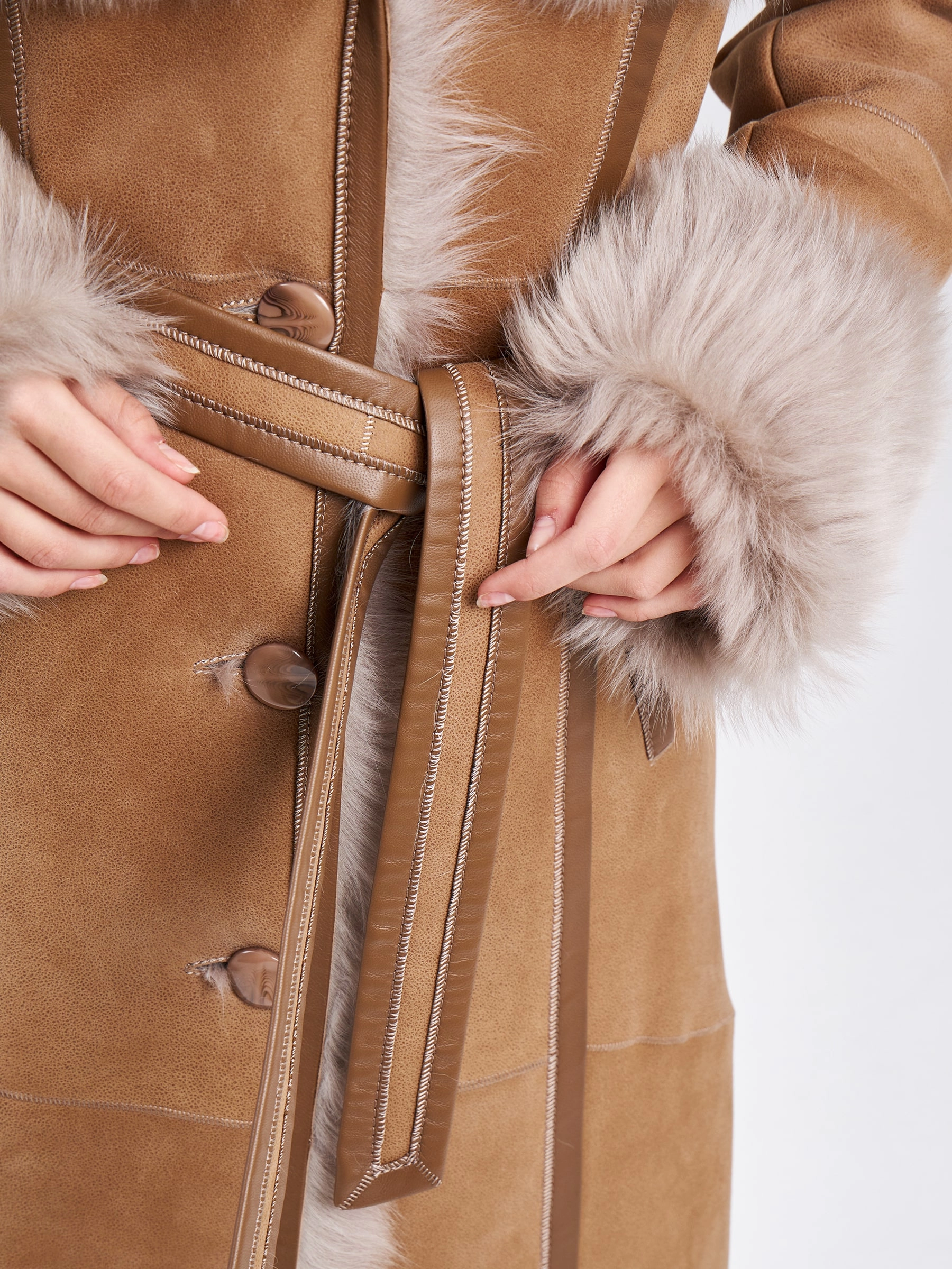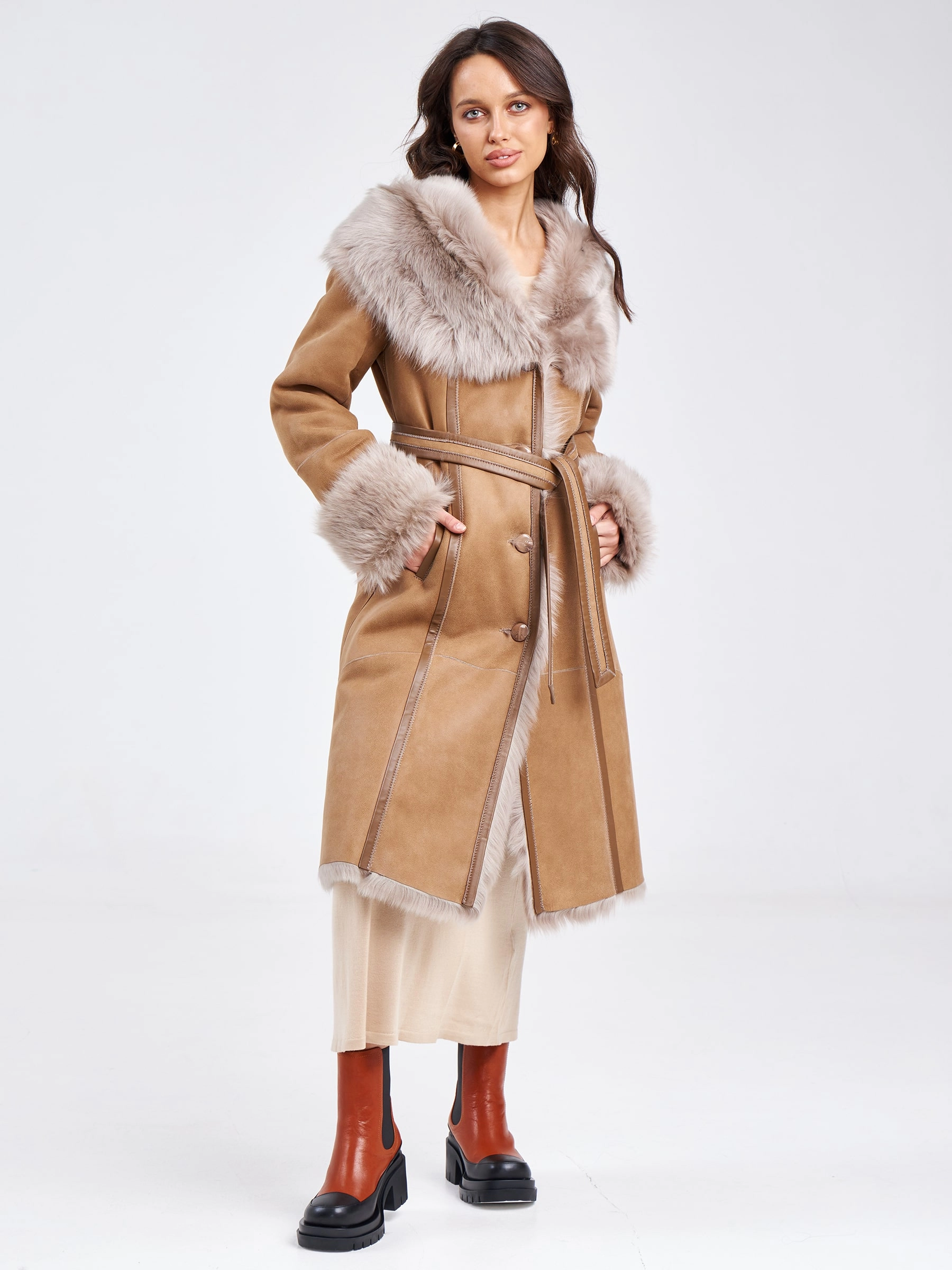 Товар женское пальто из натуральной овчины с капюшоном 132, бежевое, размер 44, артикул 62860 выполнен из овчина "тоскана" с застежкой пуговицы. Рассчитан на сезон: осень-зима. Длина изделия 110 см, силуэт полуприлегающий.