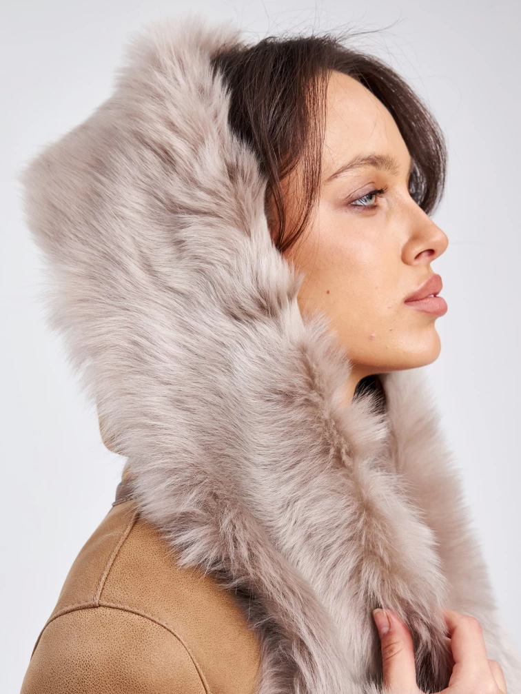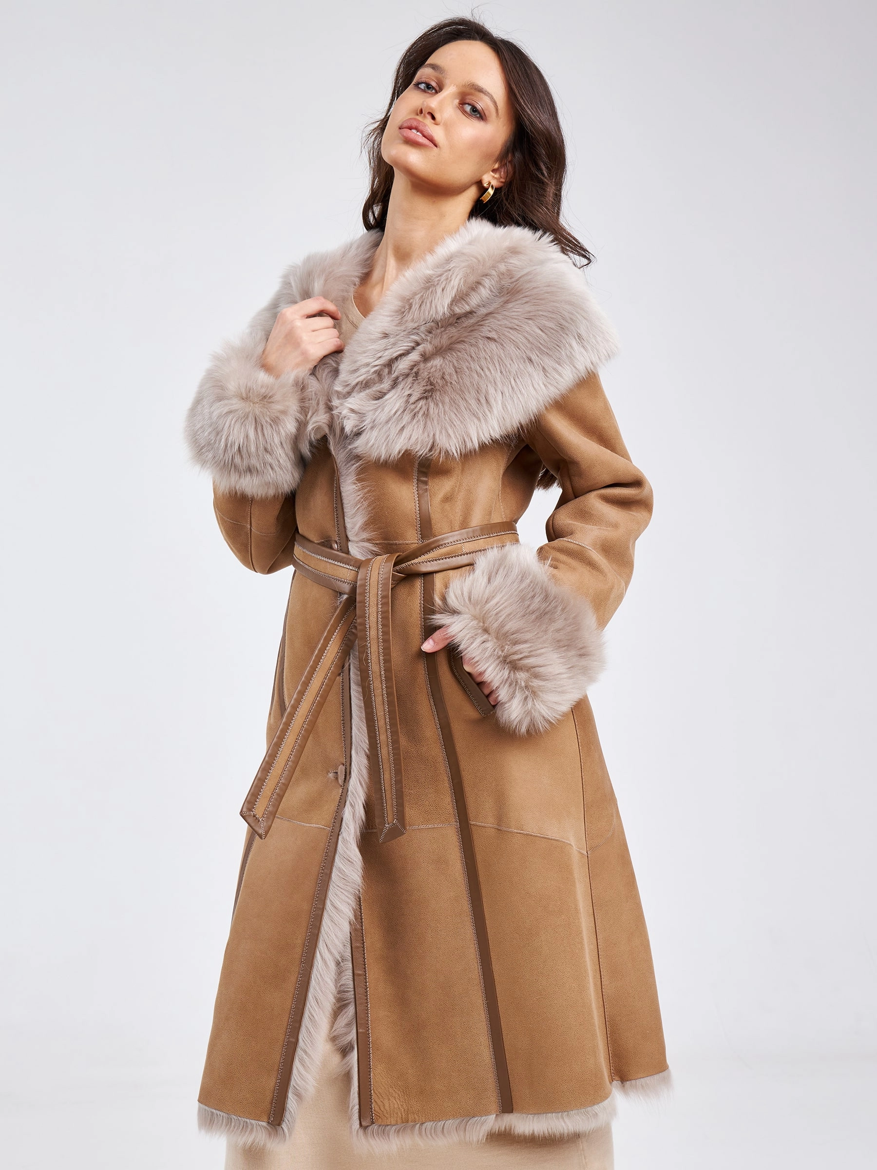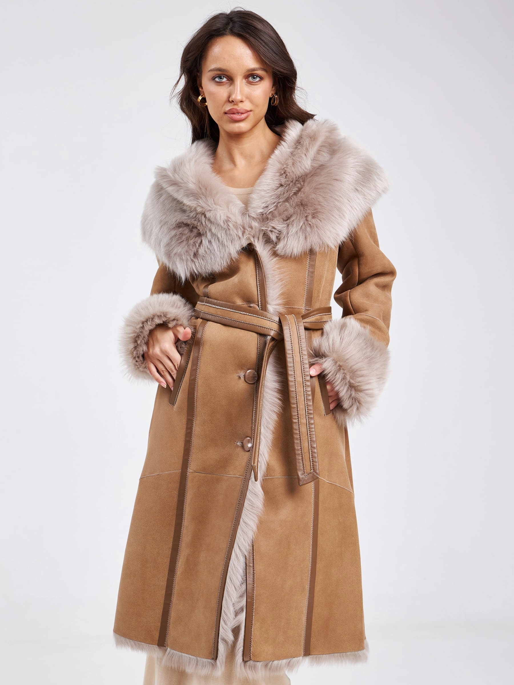 Товар женское пальто из натуральной овчины с капюшоном 132, бежевое, размер 44, артикул 62860 выполнен из овчина "тоскана" с застежкой пуговицы. Рассчитан на сезон: осень-зима. Длина изделия 110 см, силуэт полуприлегающий.
