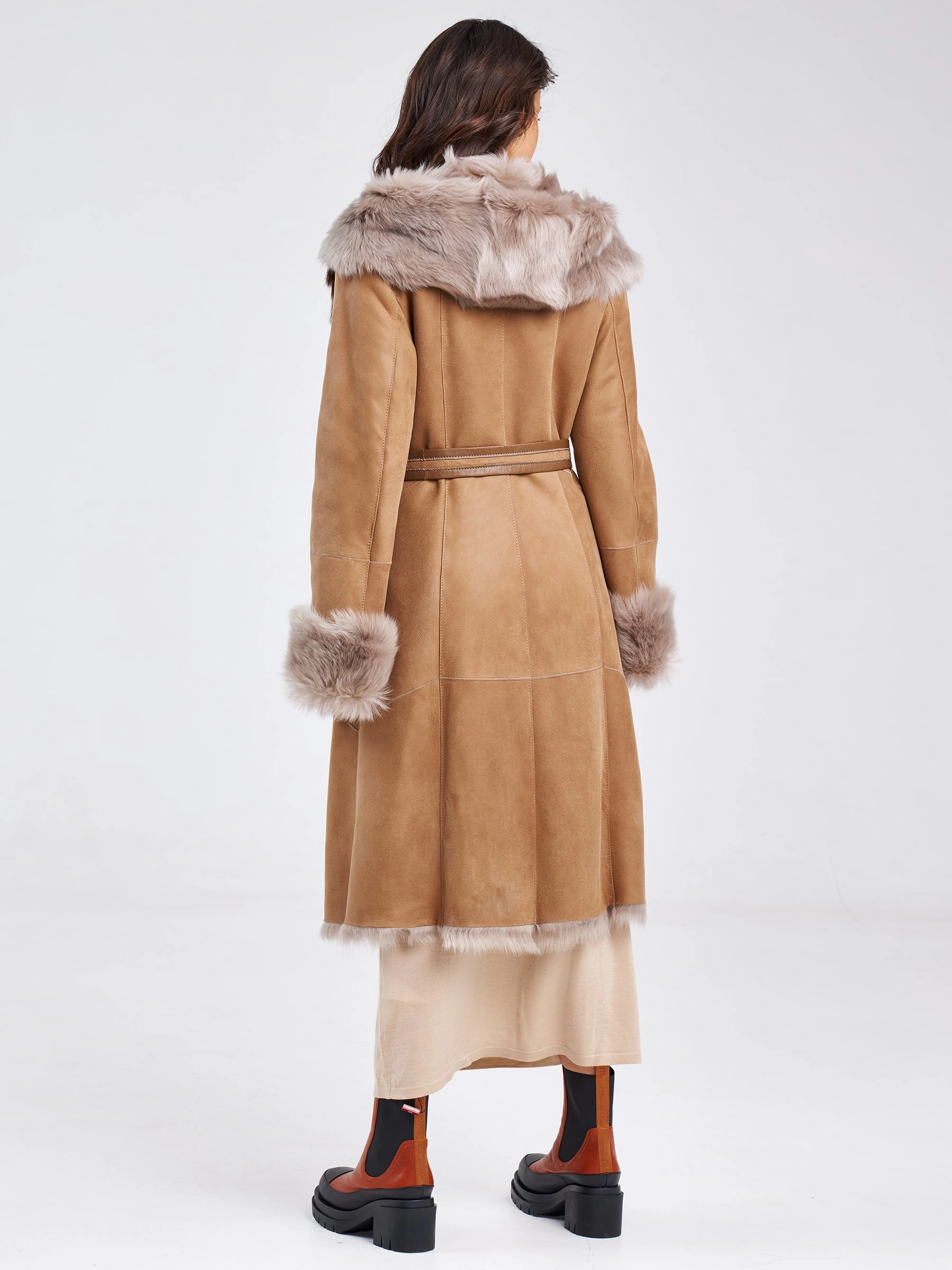 Роскошное длинное женское пальто из нежнейшей овчины "Тоскана" на пуговицах в глубоком черном цвете, с эффектным объемным капюшоном-шалью, полуприлегающим силуэтом, двумя врезными карманами и длинным поясом, обеспечивает премиальное тепло и утонченный силуэт; сочетайте ее с водолазкой и джинсами, элегантным платьем и сапогами, дополняя объемным шарфом и стильной сумкой.