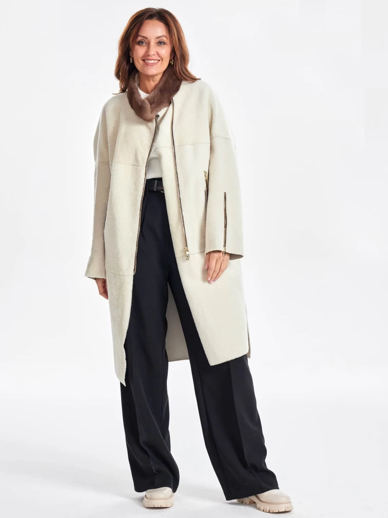 Товар женское пальто из меховой овчины с воротником из меха норки премиум класса 2022, белое, размер 48, артикул 63300 выполнен из овчина "мерино" с застежкой молния. Рассчитан на сезон: осень-зима. Длина изделия 105 см, силуэт прямой.