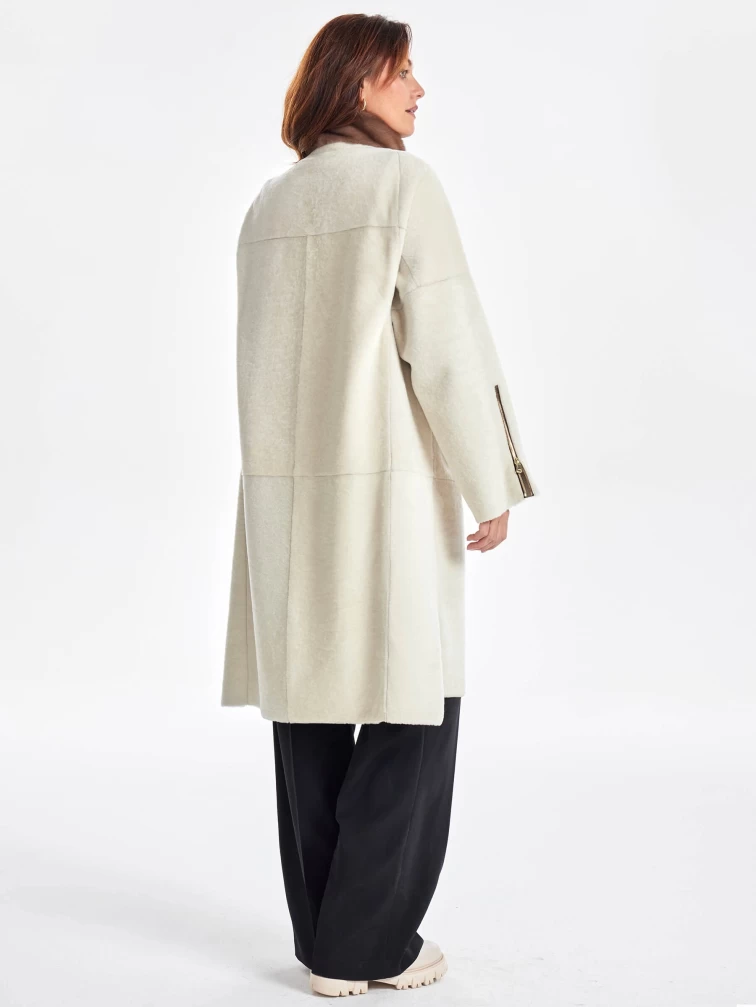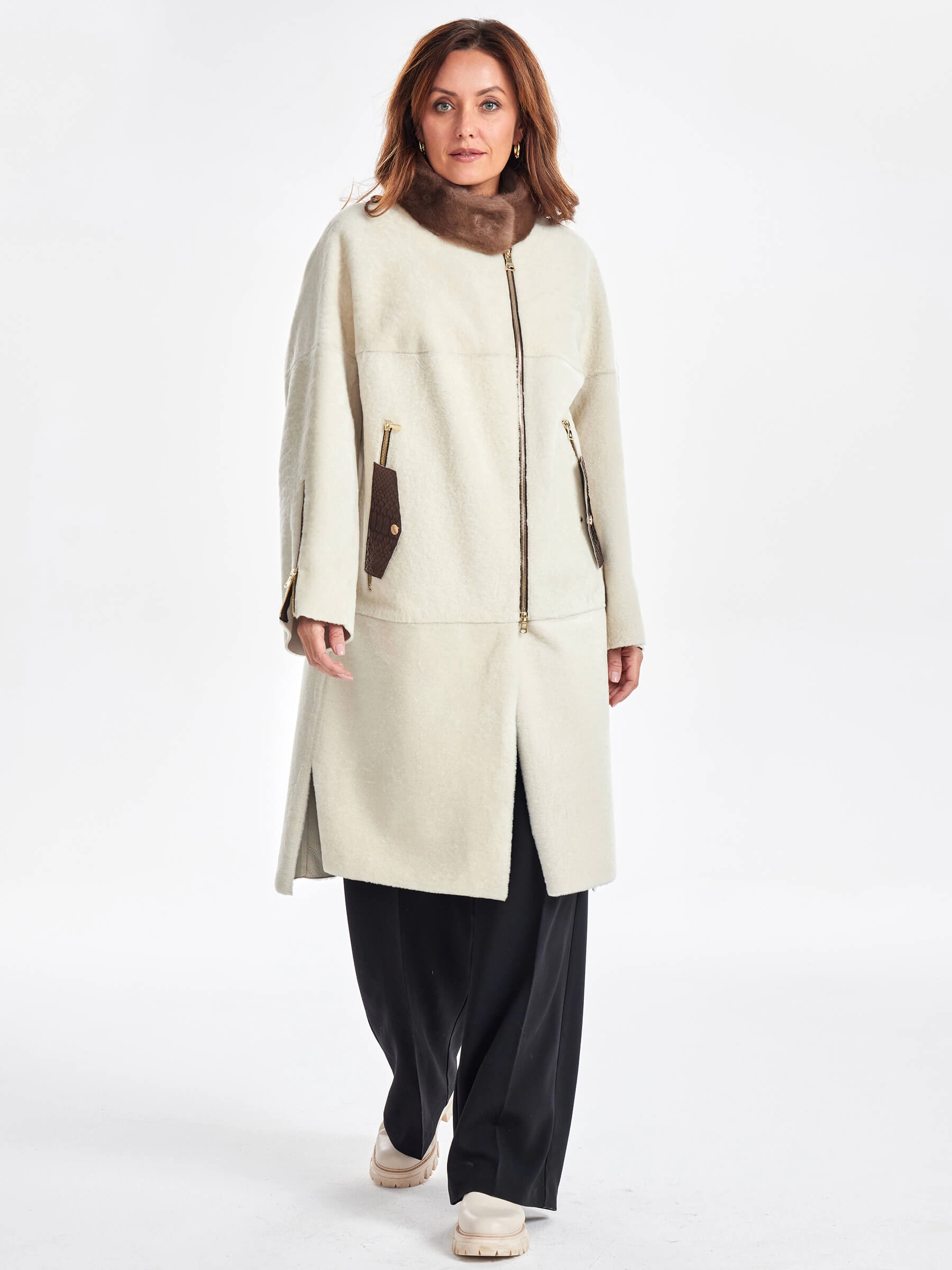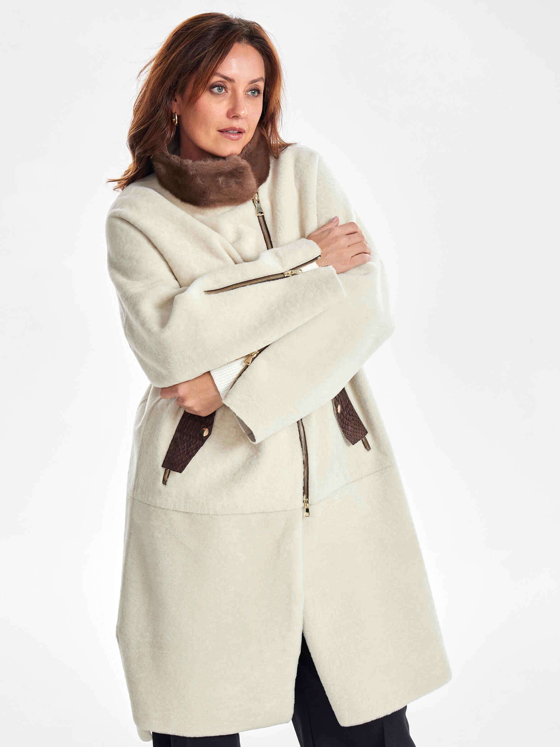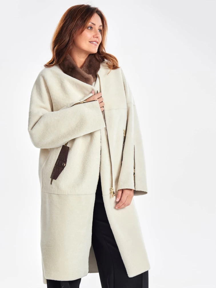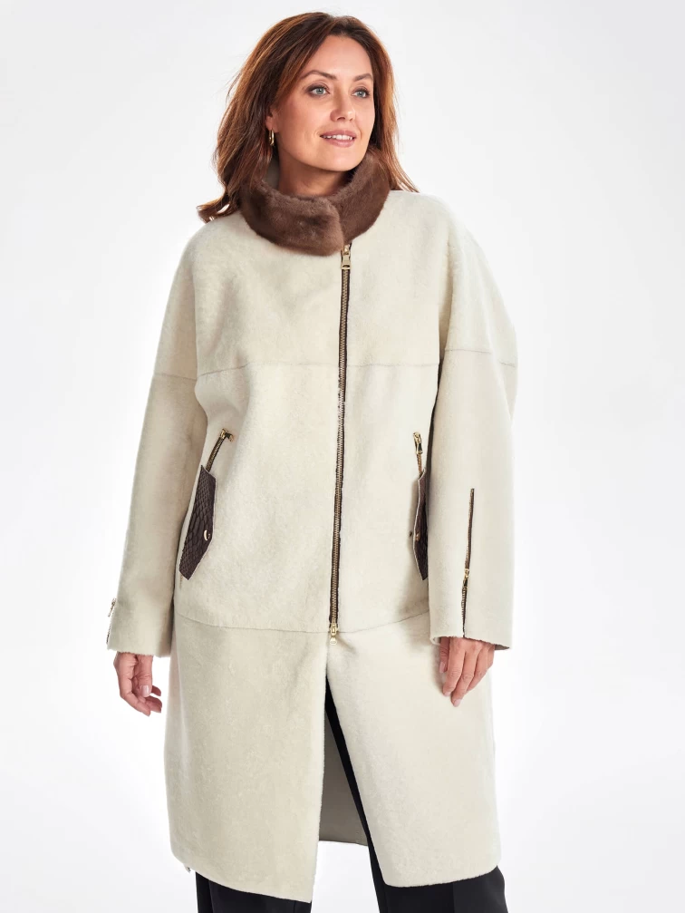 Это пальто свободного кроя из мягкой овчины ягнят не оставит равнодушной ни одну модницу. Стиль и комфорт этой модели говорят сами за себя. Воротник - стойка с меховой отделкой пушистой норки, широкий рукав, глубокие разрезы по бокам. Дополнением к модели послужили молнии на рукавах и карманах закрывающиеся кожаными клапанами.