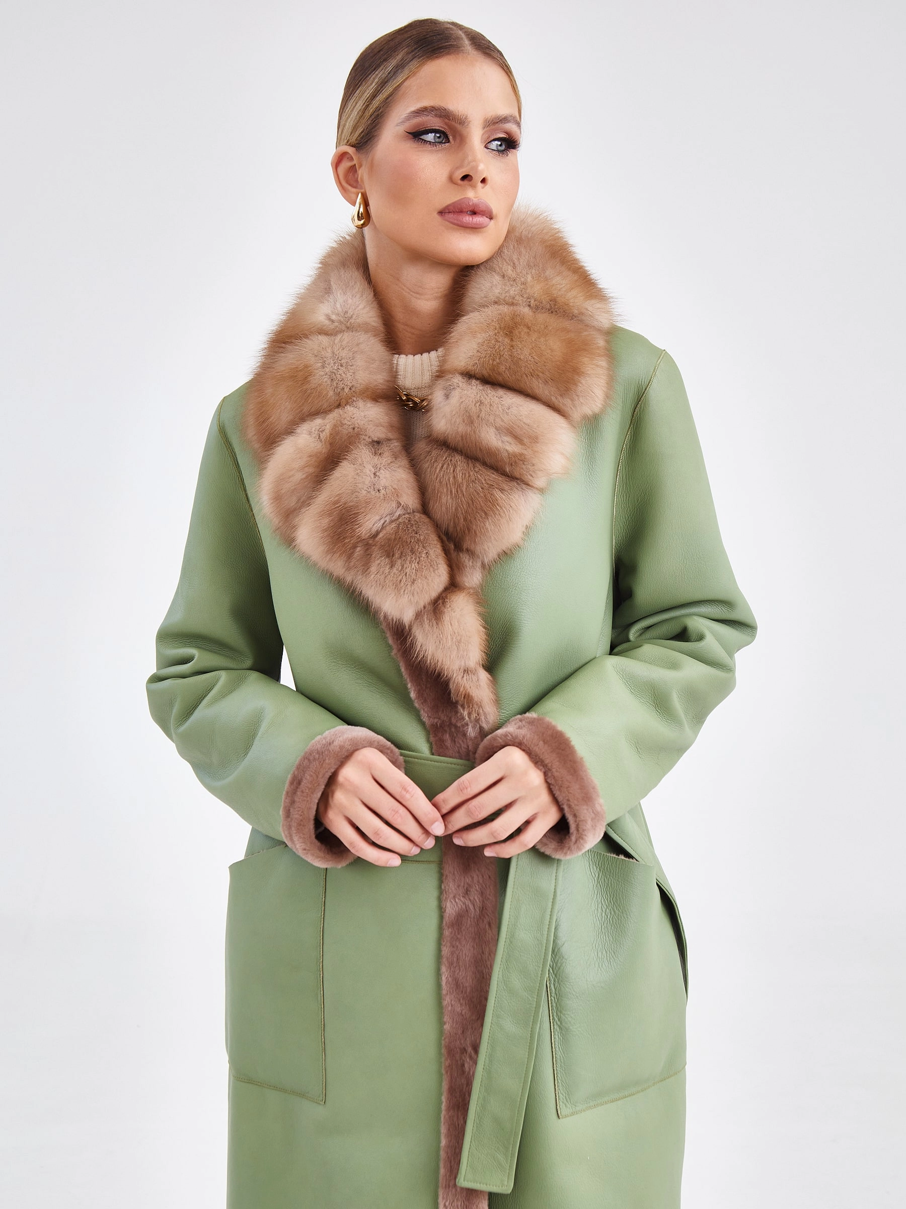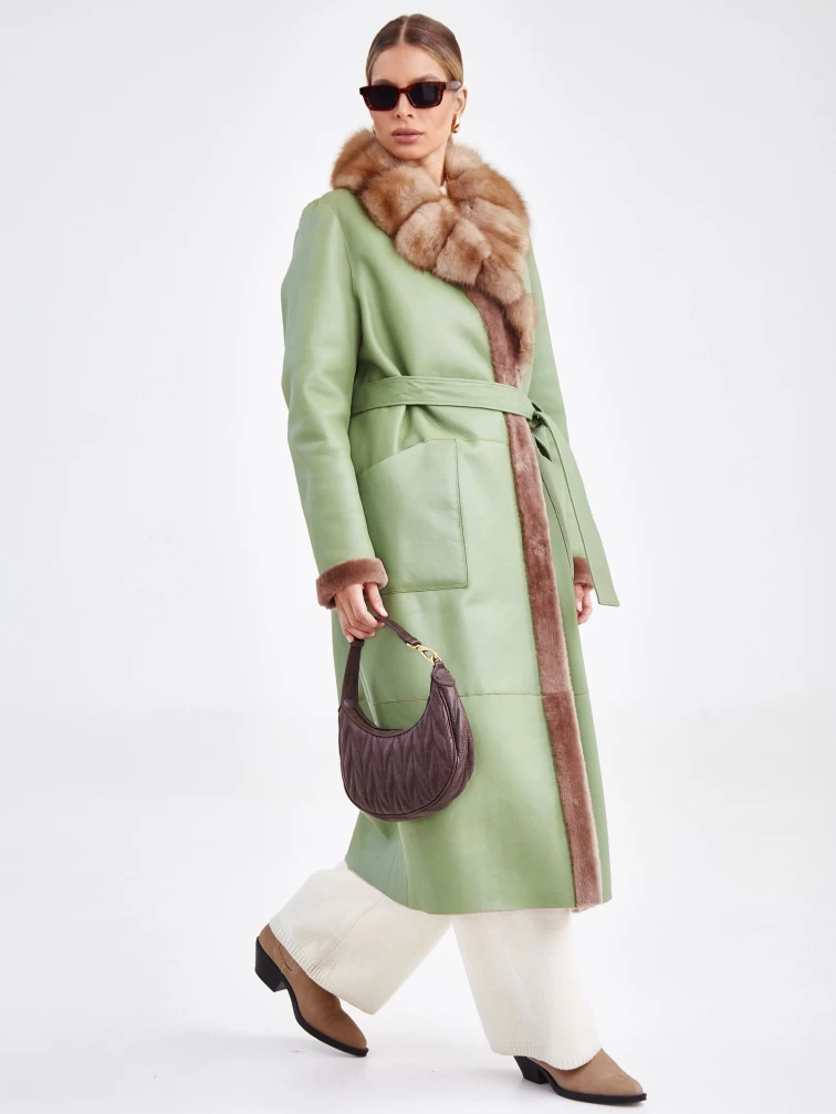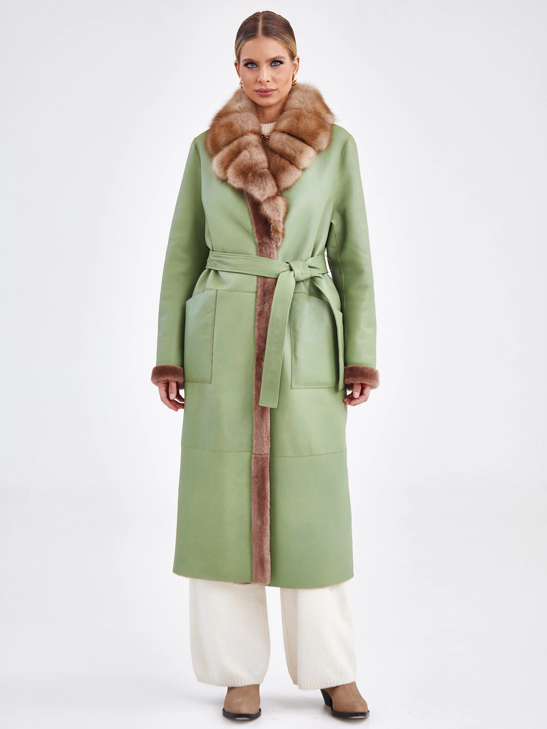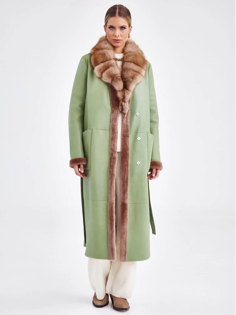Эта пальто - воплощение женственности и элегантности. Для пошива использовали мягкую плотную овчину, сочетая два цвета: бежевый и оливковый. Изделие получилось легким и теплым. Прямой силуэт, комфортная посадка. Английский воротник выполнили из царского меха куницы. Застежка - кнопки. Манжеты и борт дополнили тонкой шелковистой овчиной. Длинный пояс поможет изменить силуэт, сделав его приталенным.
