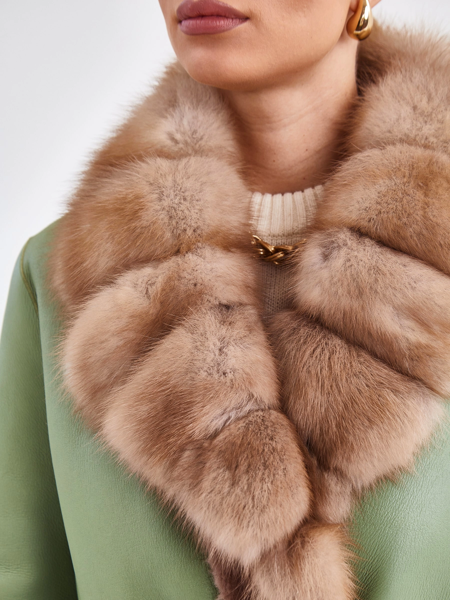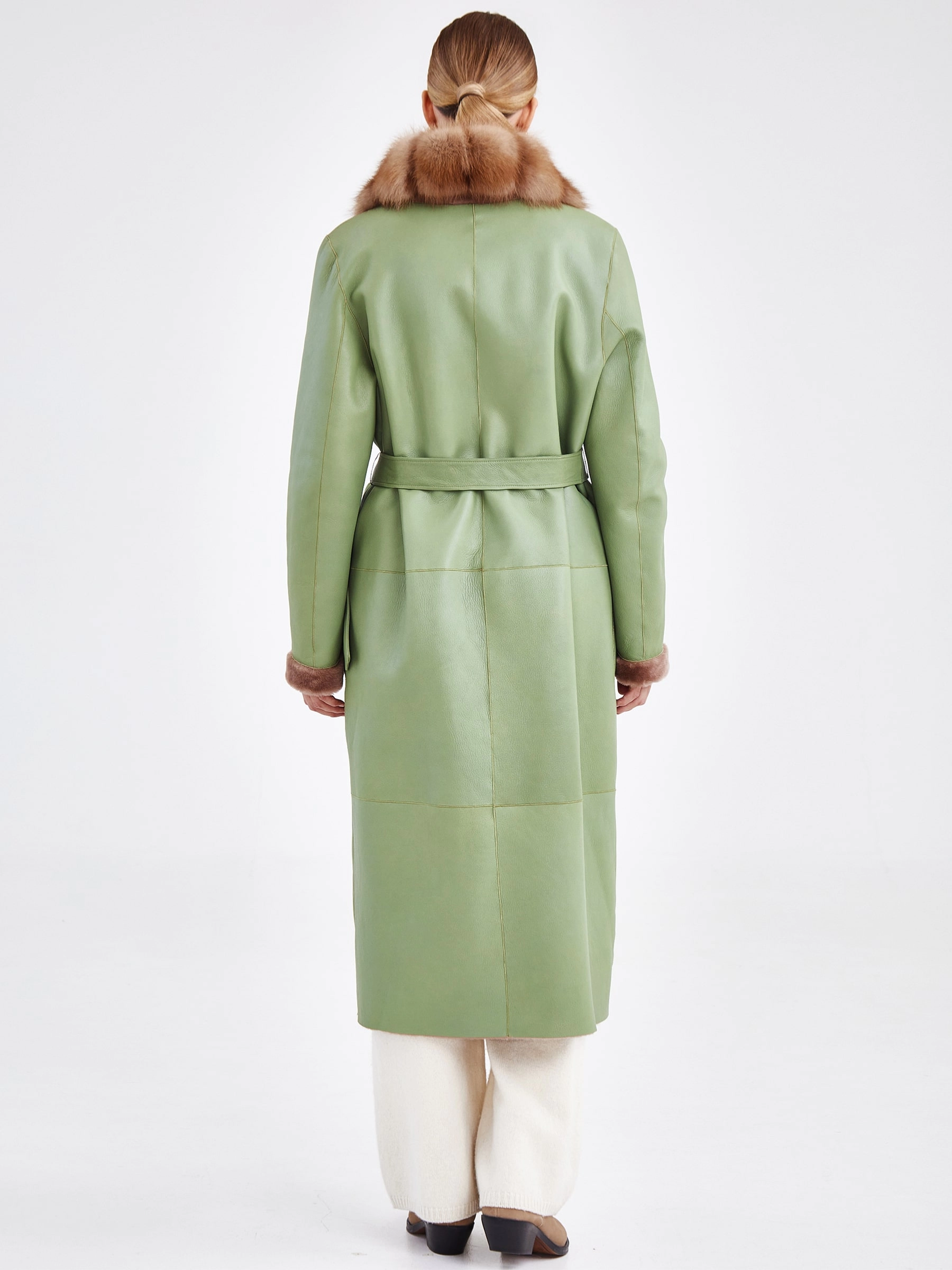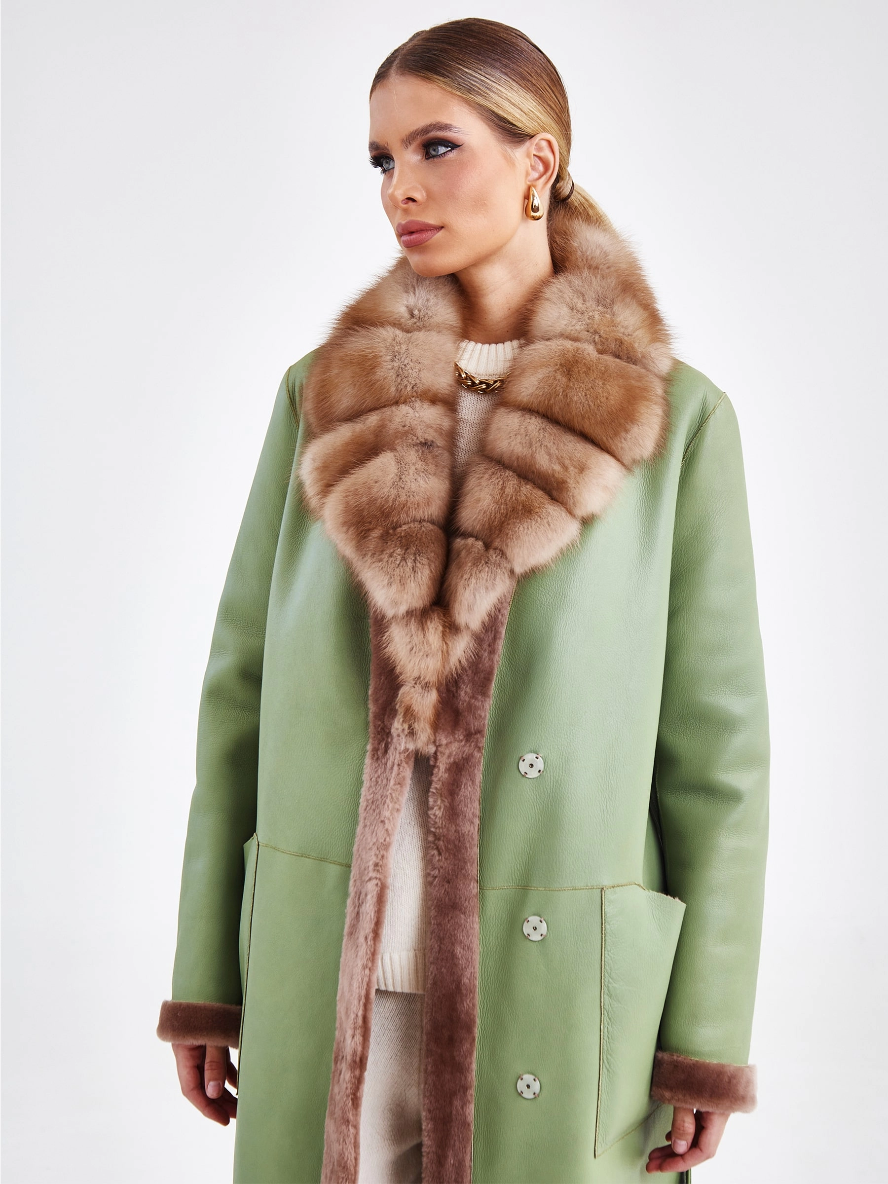 Эта пальто - воплощение женственности и элегантности. Для пошива использовали мягкую плотную овчину, сочетая два цвета: бежевый и оливковый. Изделие получилось легким и теплым. Прямой силуэт, комфортная посадка. Английский воротник выполнили из царского меха куницы. Застежка - кнопки. Манжеты и борт дополнили тонкой шелковистой овчиной. Длинный пояс поможет изменить силуэт, сделав его приталенным.