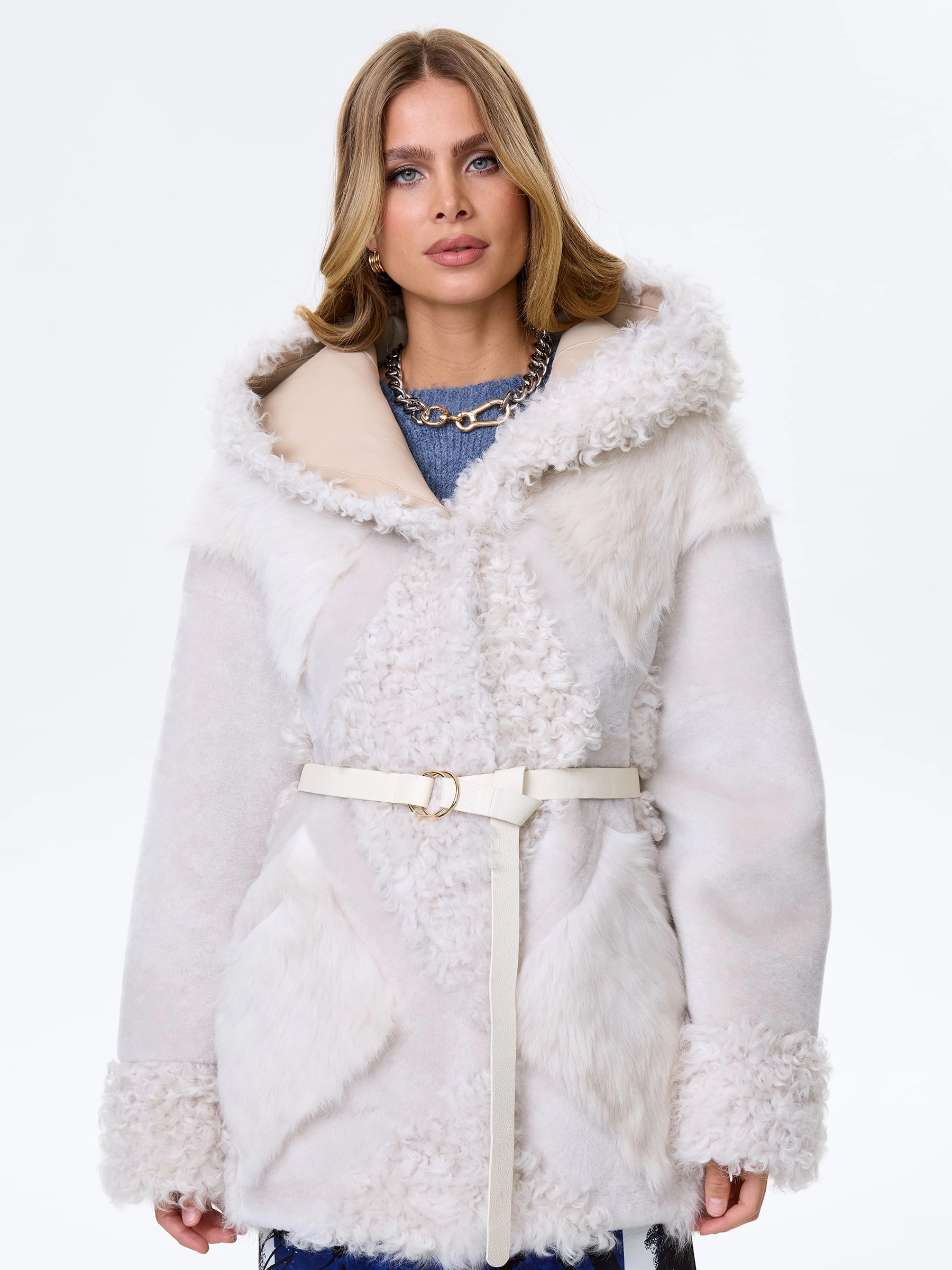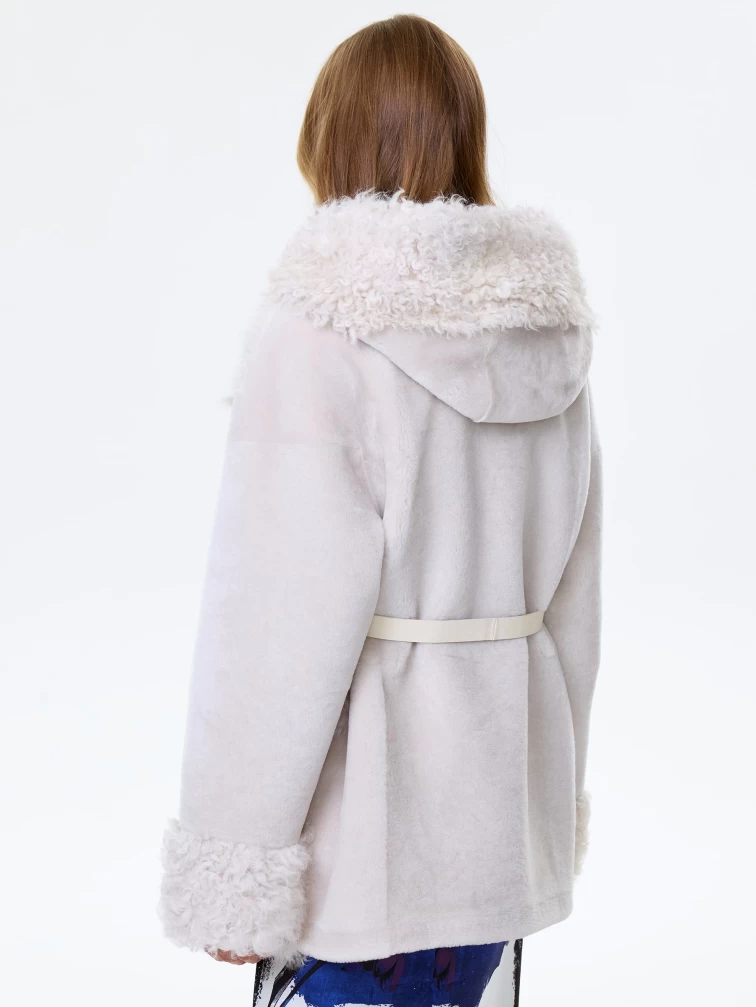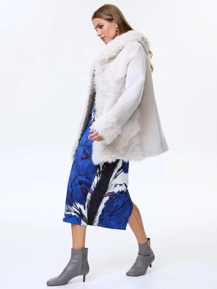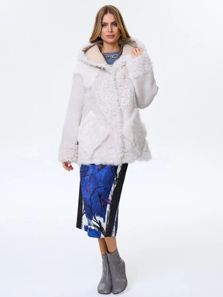 Товар женское полупальто из натуральной овчины с мехом тиградо премиум класса 2027, белое, размер 44, артикул 64410 выполнен из овчина "мерино" с застежкой кнопки. Рассчитан на сезон: осень-зима. Длина изделия 73 см, силуэт свободный.