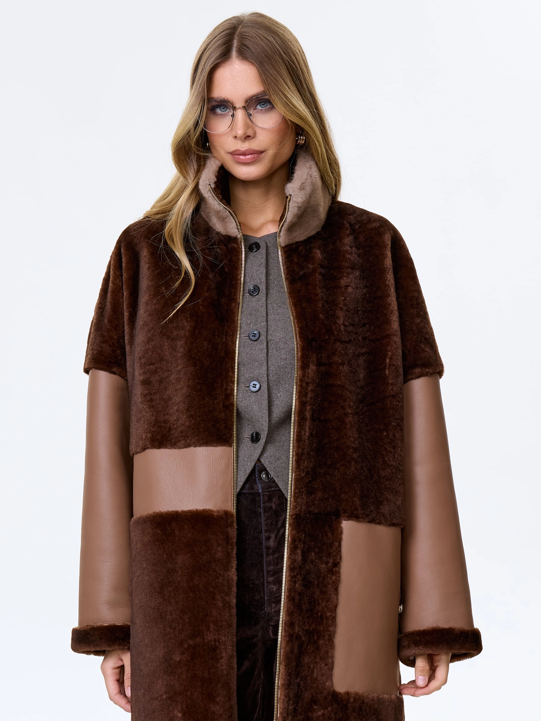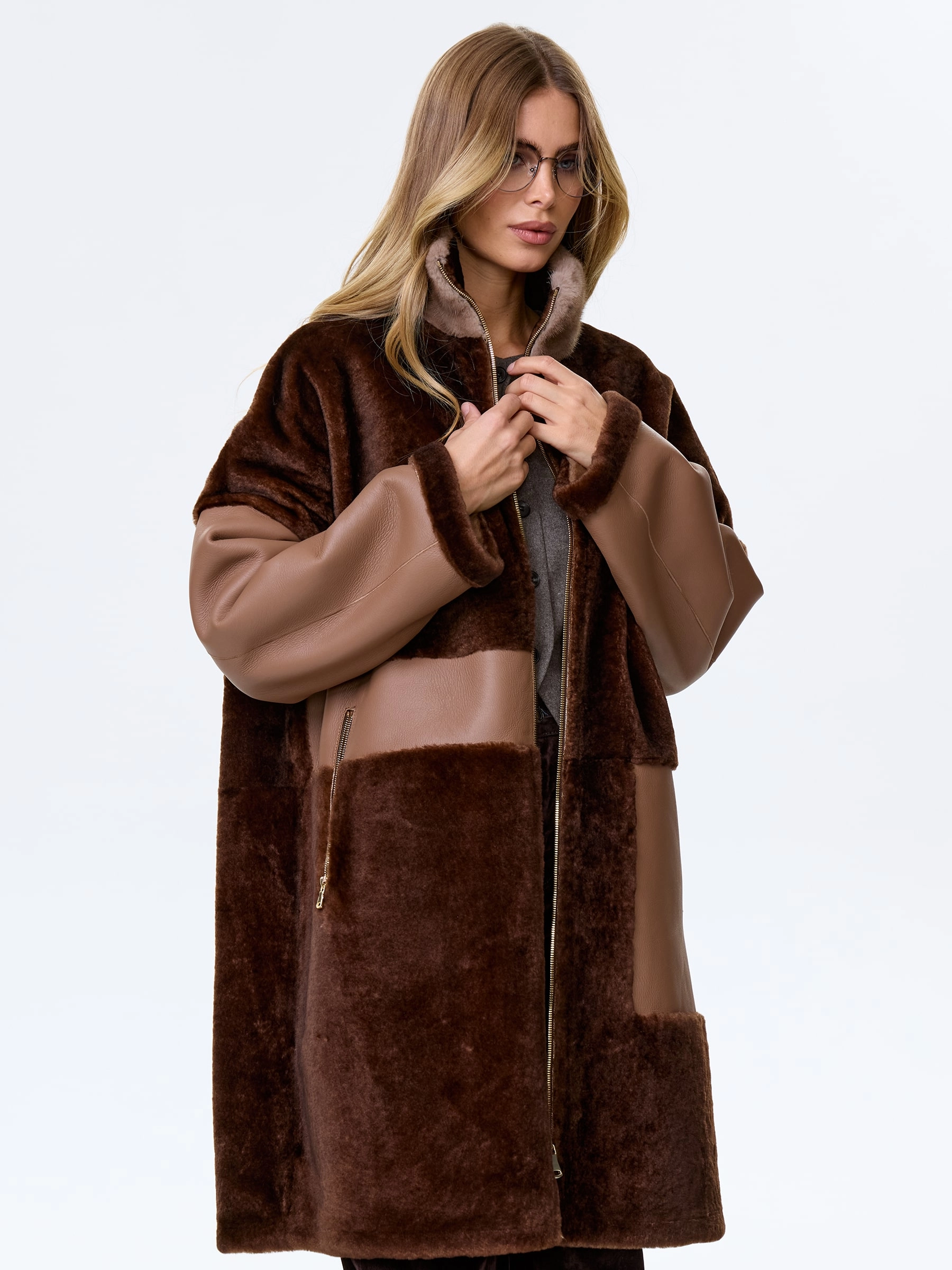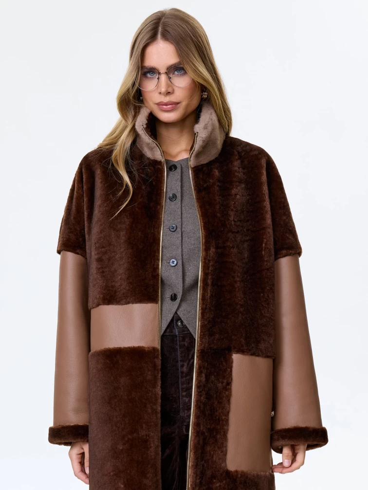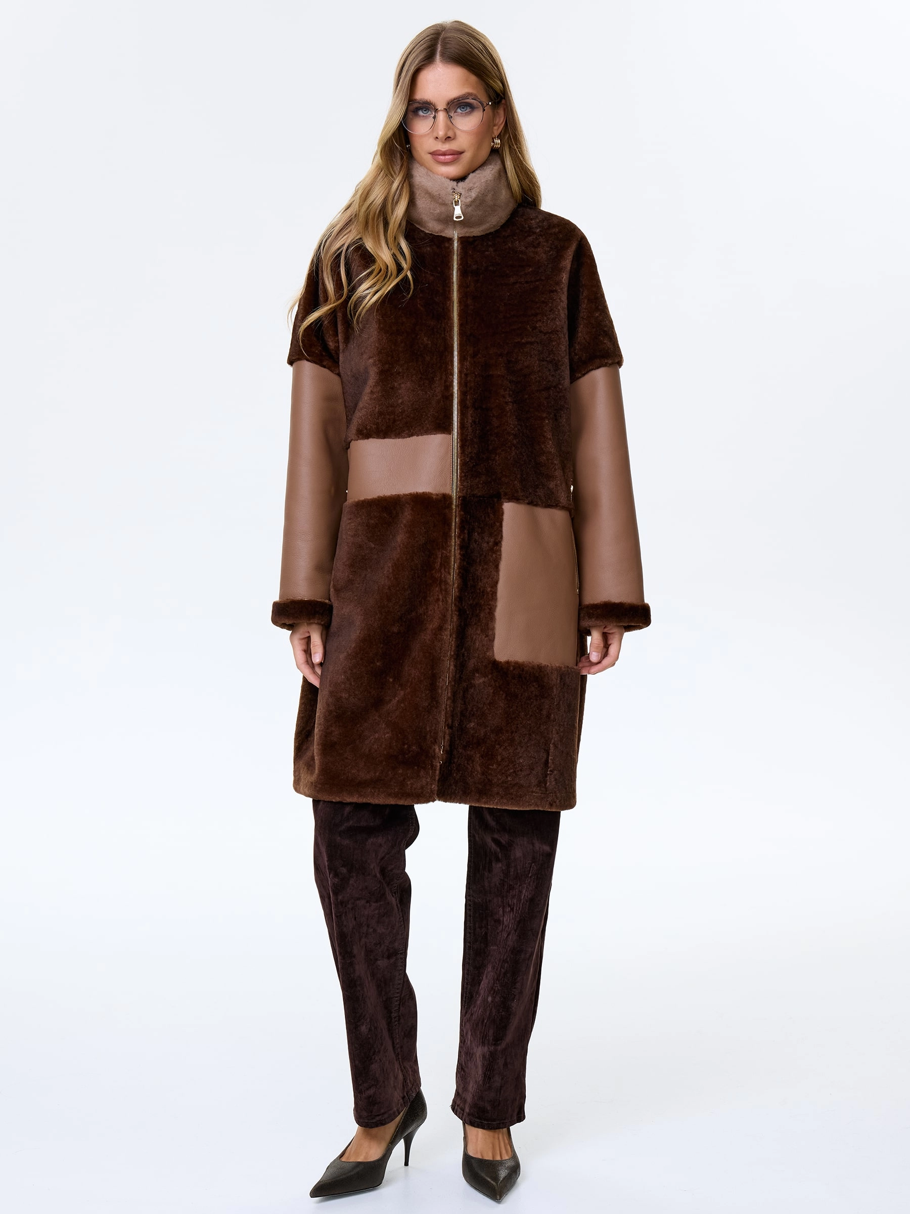 Для пошива этого полупальто из натуральной овчины использовали мягкую овчину с коротким бархатистым ворсом в комбинации с гладкой поверхностью. Свободный крой не сковывает движения. Объемный воротник-стойку подчеркнули густым мехом норки. Два врезных боковых кармана как и само полупальто застегиваются крупными молниями.