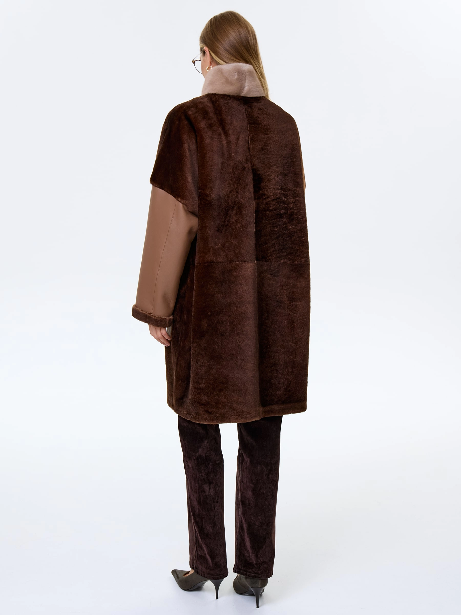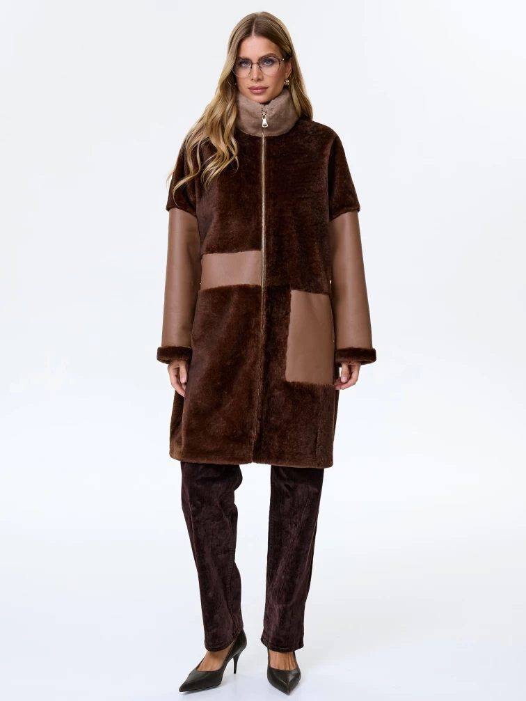 Товар женское полупальто из натуральной овчины с норковым воротником премиум класса 2038, коричневое, размер 46, артикул 64260 выполнен из овчина "мерино" с застежкой молния. Рассчитан на сезон: осень-зима. Длина изделия 95 см, силуэт прямой.