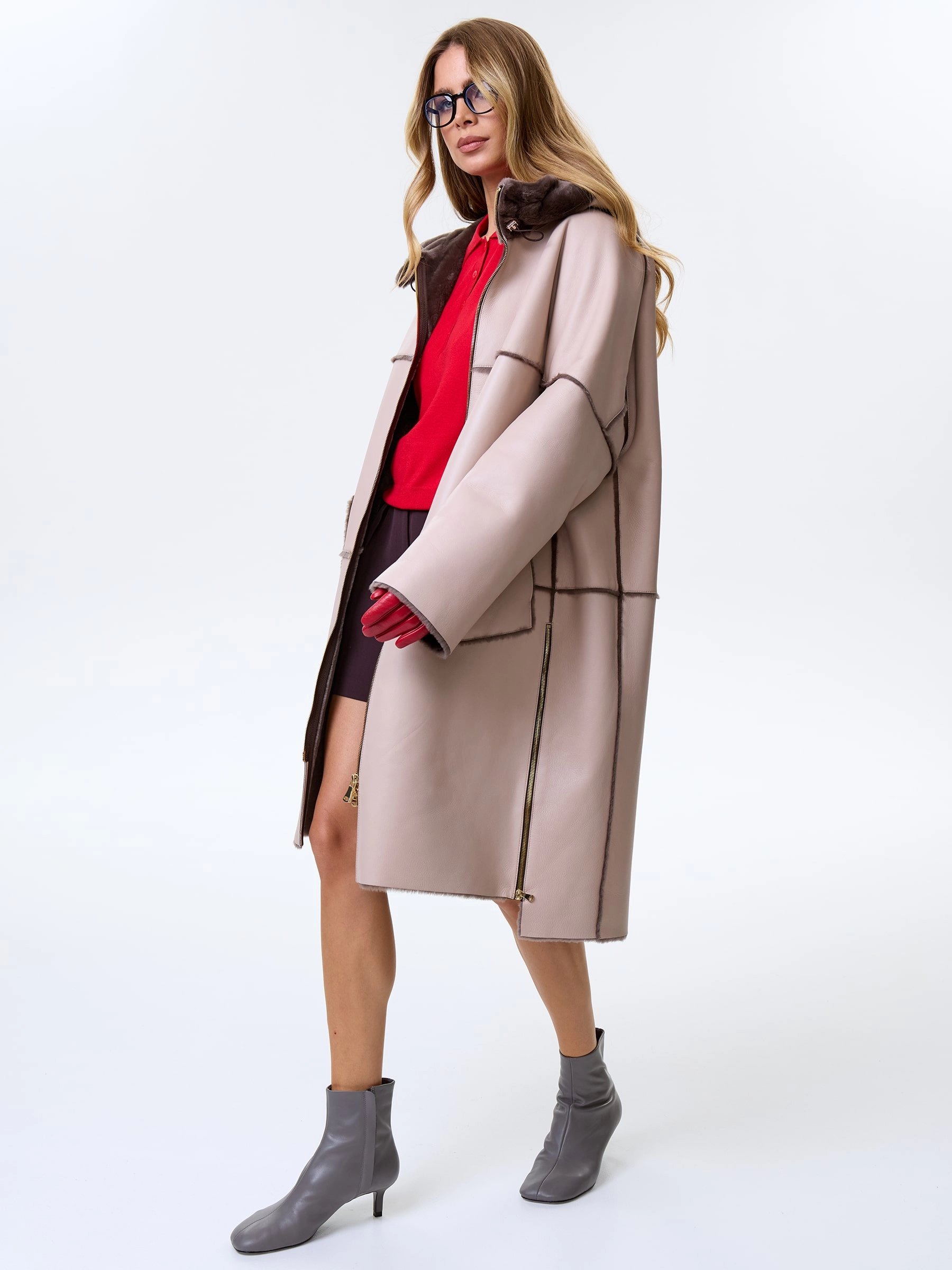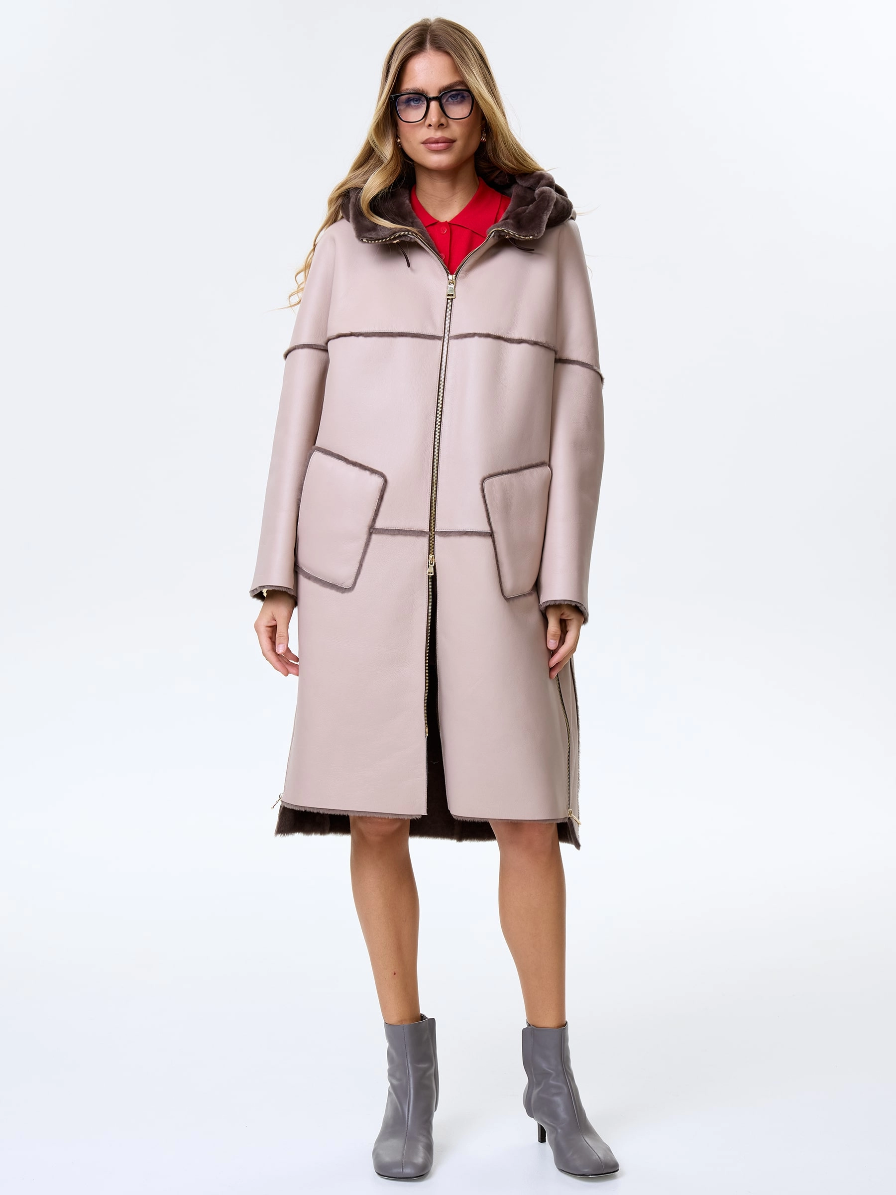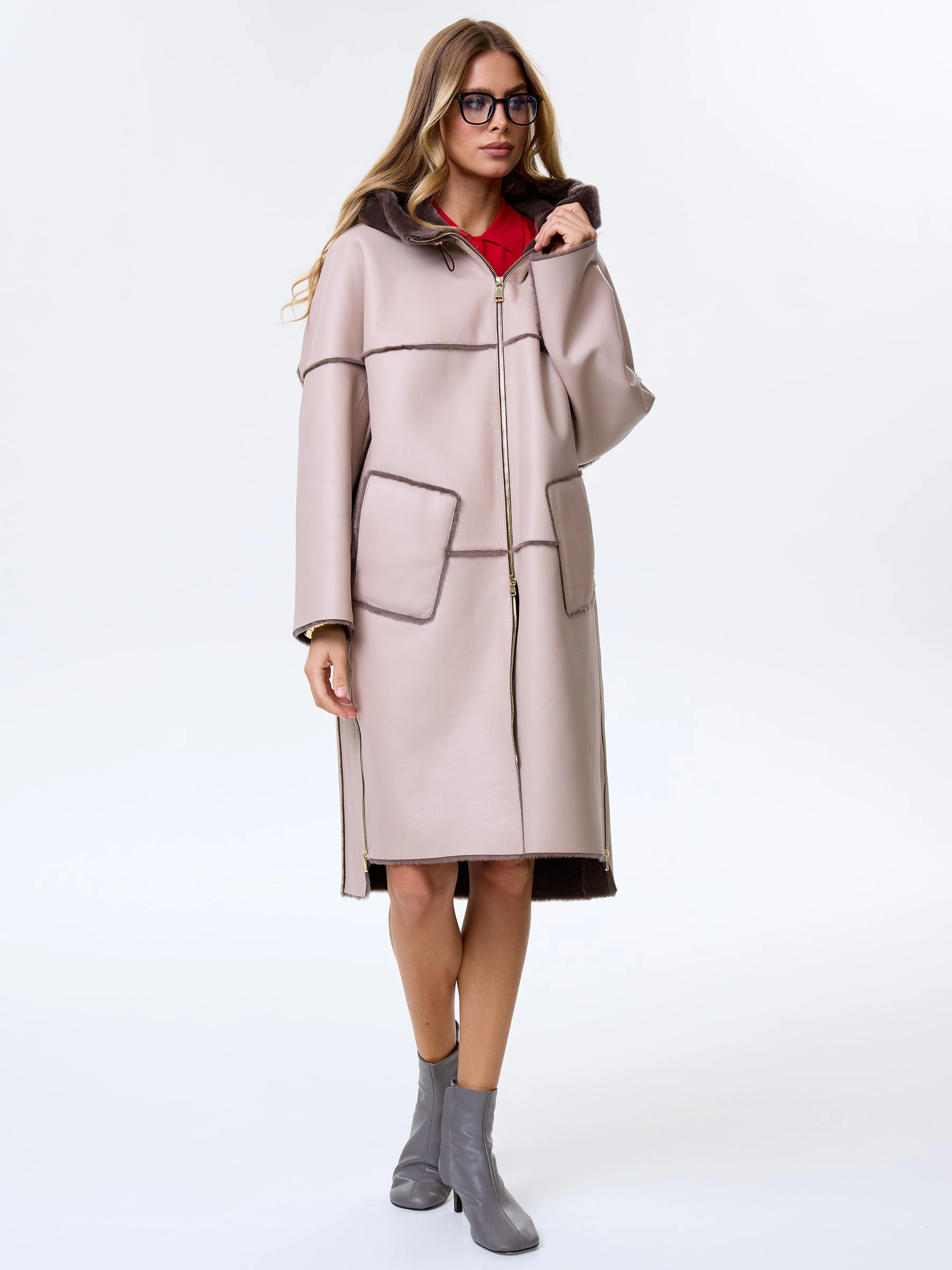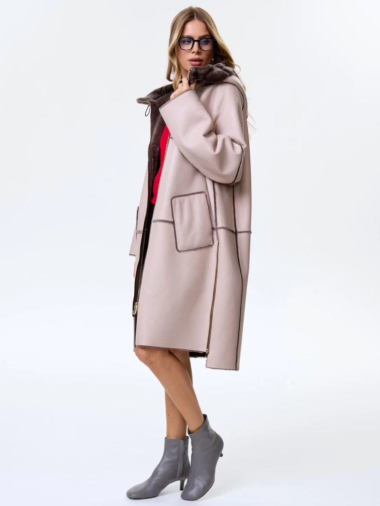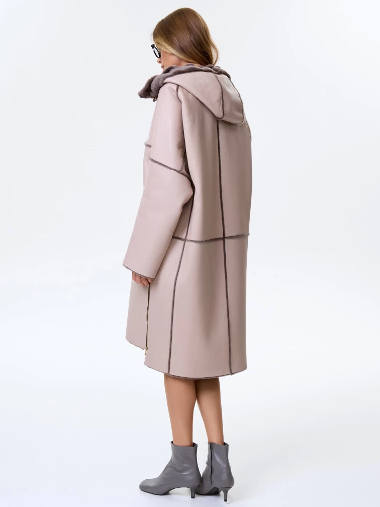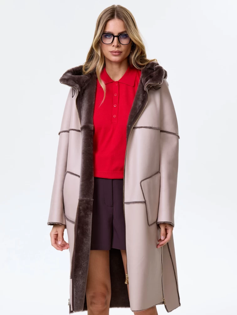 Длинное пальто свободного кроя выполнили из плотной овчины с гладкой фактурой и вывернутыми наружу швами. Меховое пальто получилась не только максимально теплым, но и комфортным. Боковые разрезы как и само изделие застегиваются крупными молниями. Объемный регулируемый капюшон, позволяет обойтись без головного убора.