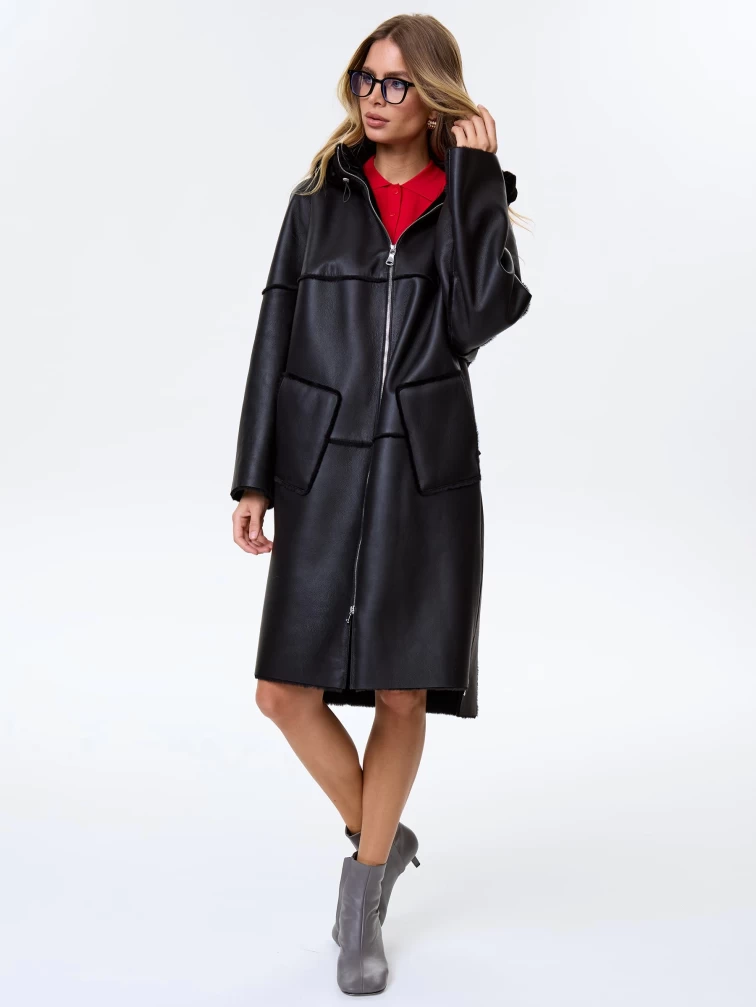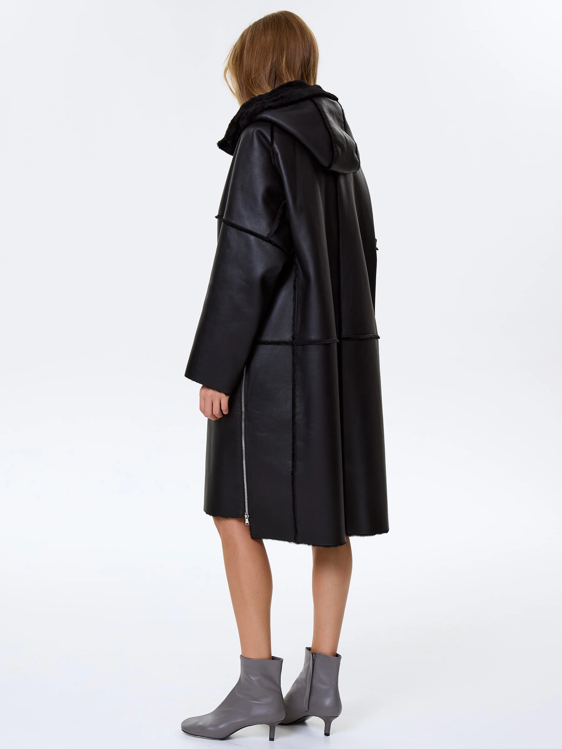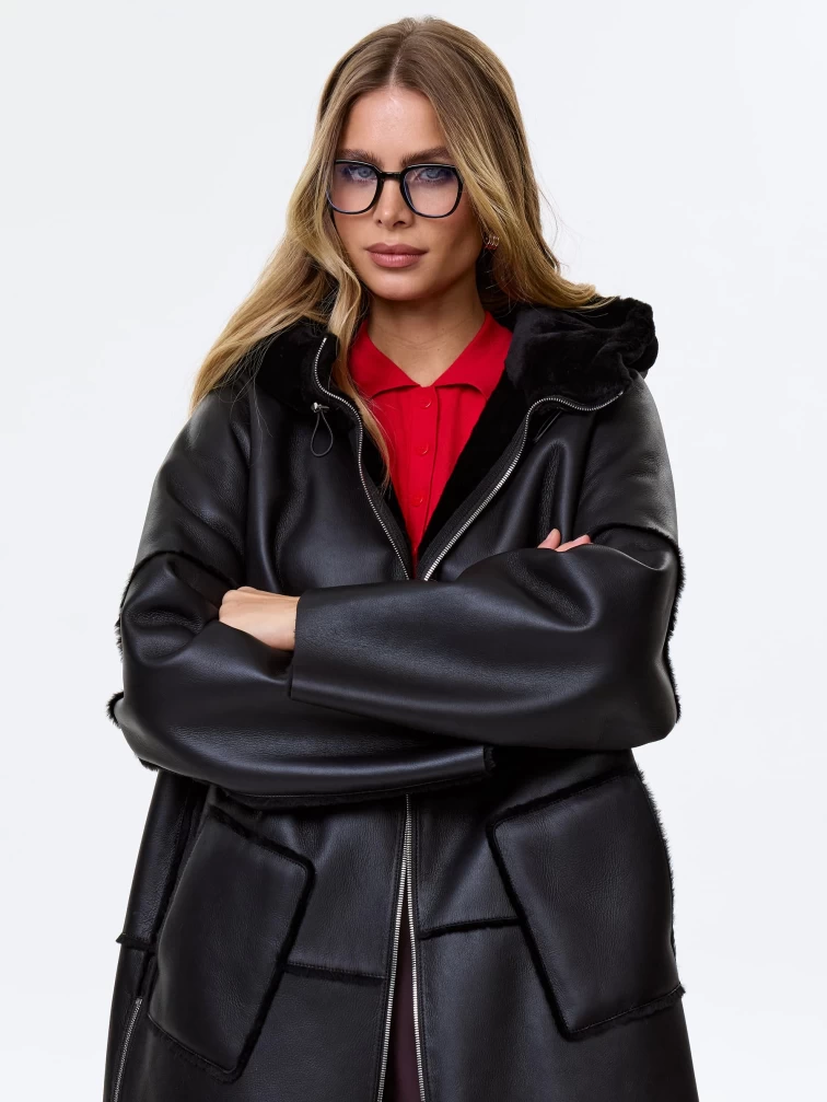 Длинное пальто свободного кроя выполнили из плотной овчины с гладкой фактурой и вывернутыми наружу швами. Меховое пальто получилась не только максимально теплым, но и комфортным. Боковые разрезы как и само изделие застегиваются крупными молниями. Объемный регулируемый капюшон, позволяет обойтись без головного убора.
