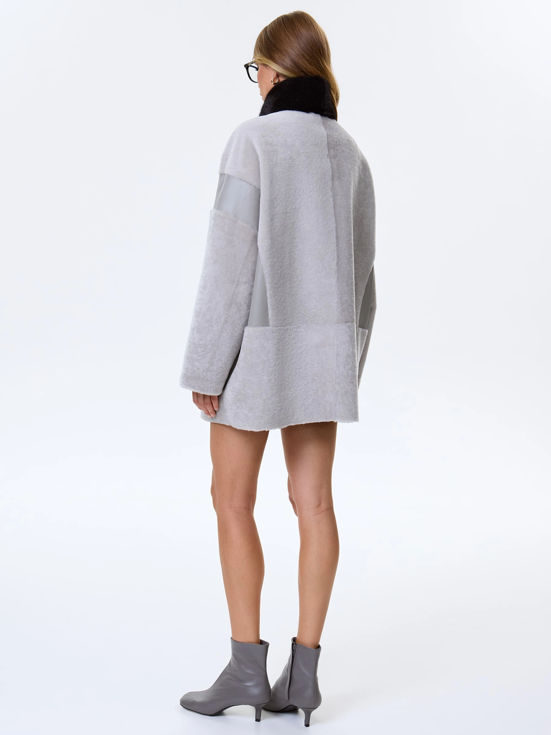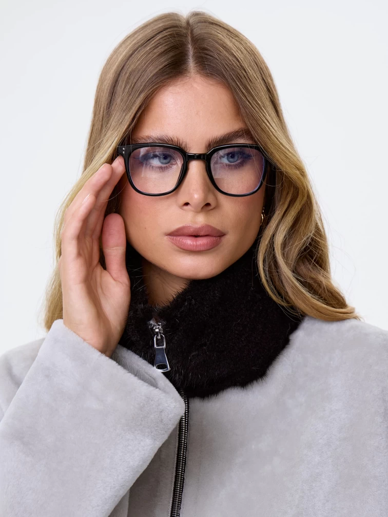 Полупальто свободного кроя выполнили овчины премиум класса в классическом черном цвете. Модель получилась максимально теплой, но при этом легкой и комфортной. Боковые карманы как и само изделие застегиваются молниями. Объемный воротник- стойку дополнили густой норкой.