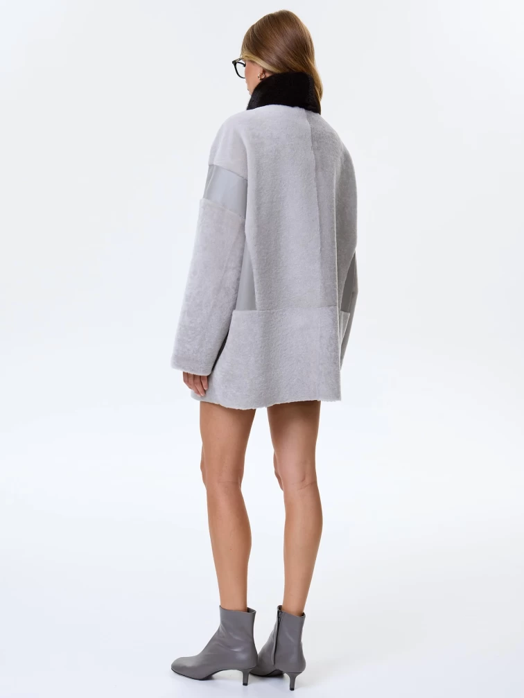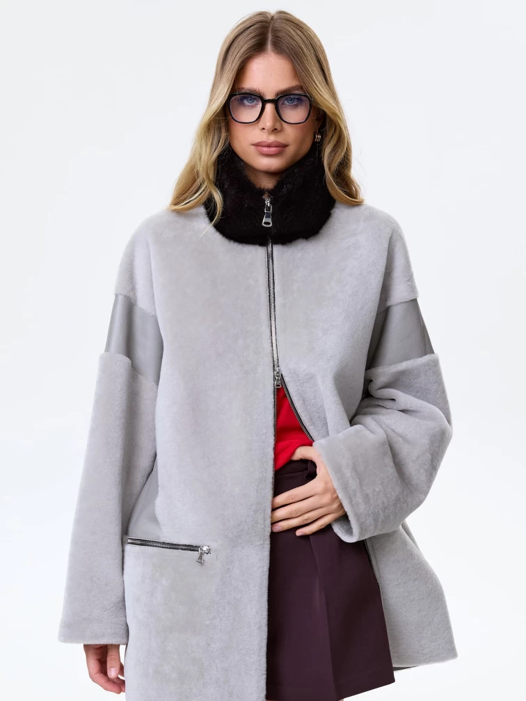 Товар женское полупальто с норковым воротником из натуральной овчины премиум класса 2057, серое, размер 44, артикул 64500 выполнен из овчина "мерино" с застежкой молния. Рассчитан на сезон: осень-зима. Длина изделия 77 см, силуэт свободный.