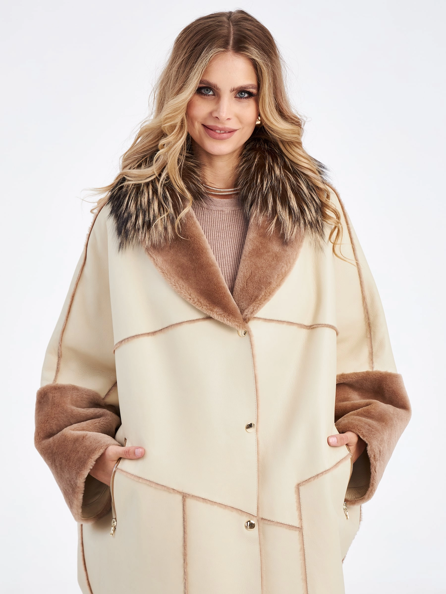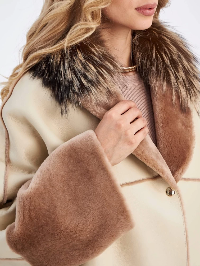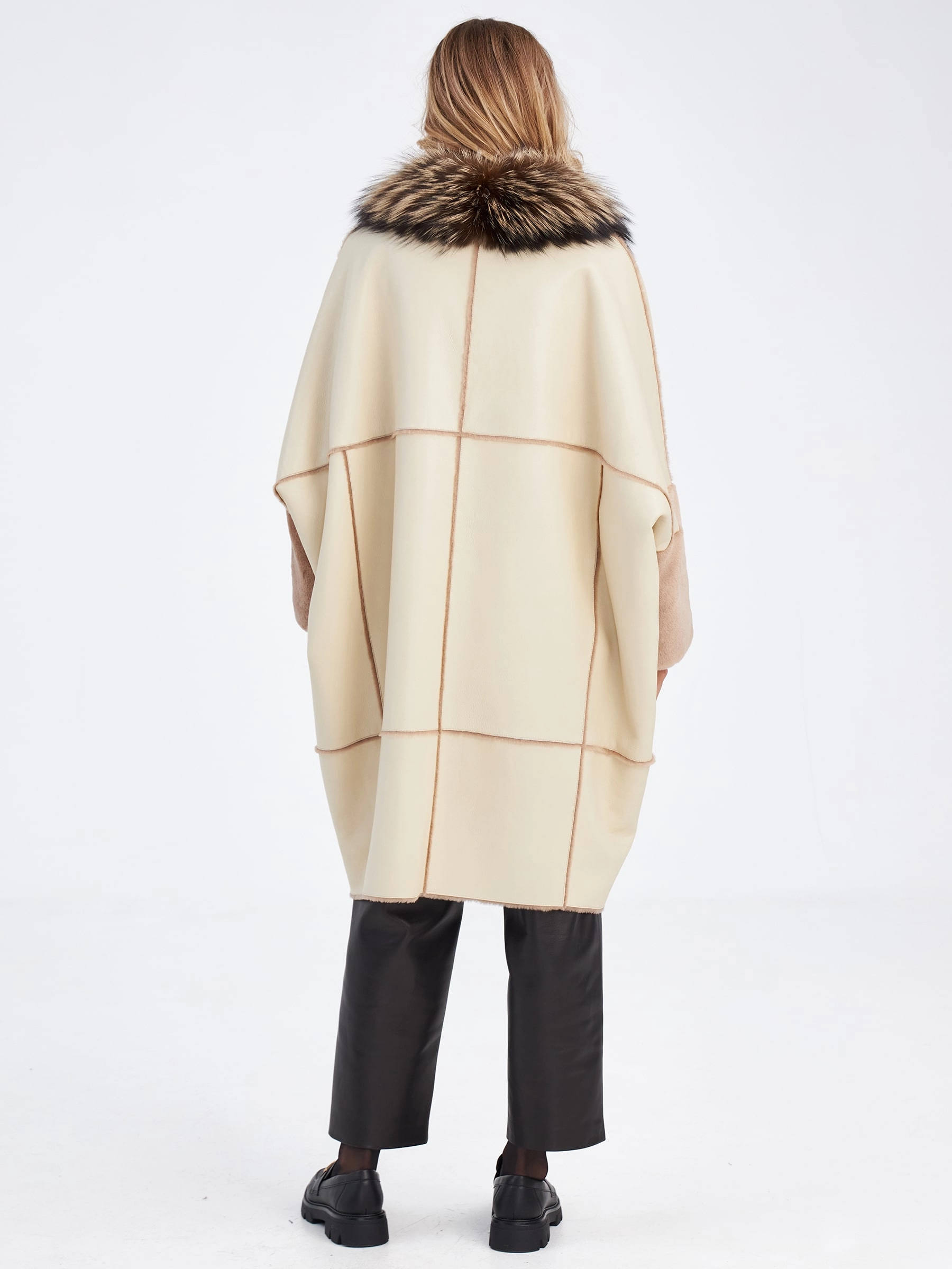 Пальто свободного кроя с использованием мягкой овчины с коротким бархатистым ворсом с одной стороны и гладкой поверхностью с другой. Внутренняя сторона хорошо сохраняет тепло. Графичность вещи добавляет отделка изнаночных швов в коричневом цвете. Шалевидный воротник подчеркнули воротником из меха лисицы.