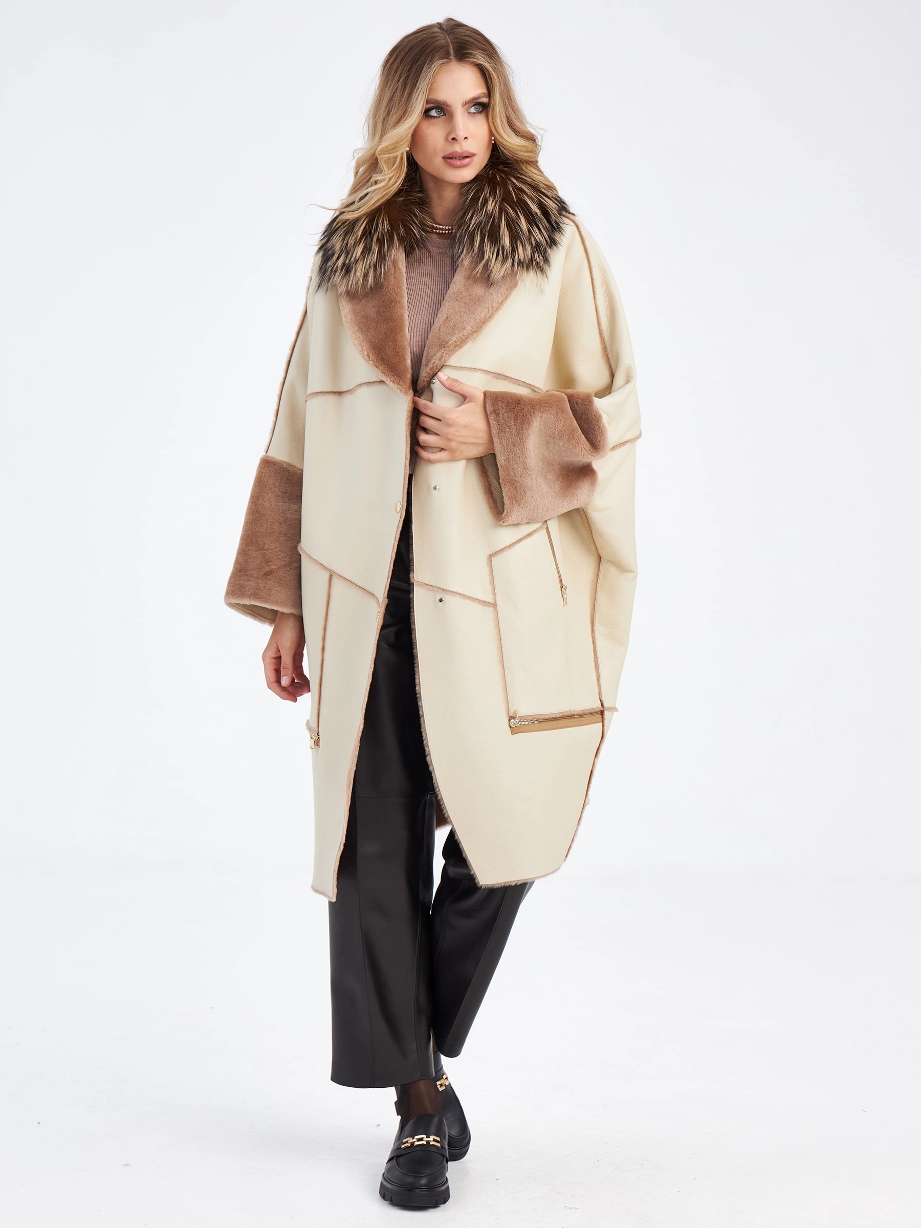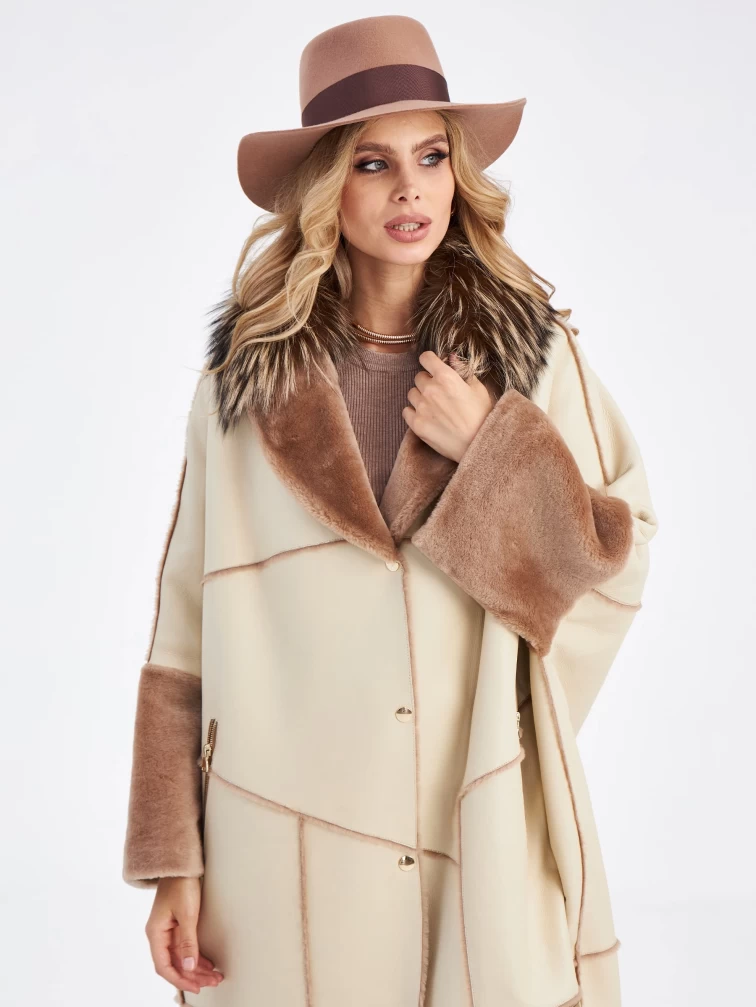 Товар женское стильное пальто оверсайз с воротником из меха лисицы премиум класса 2046, размер 44, артикул 63660 выполнен из овчина "мерино" с застежкой молния. Рассчитан на сезон: осень-зима. Длина изделия 110 см, силуэт прямой.