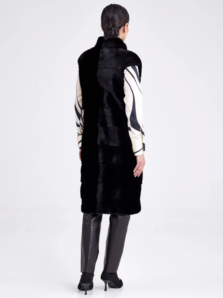 Длинный жилет-это отличное дополнение к образу. Изделие сшили из нежного густого меха норки. Универсальный черный цвет, прямой крой, миниум фурнитуры и полное отсутствие декора. Горизонтальная раскладка меха.Идеальное сочетание с кожаными брюками,юбкой.