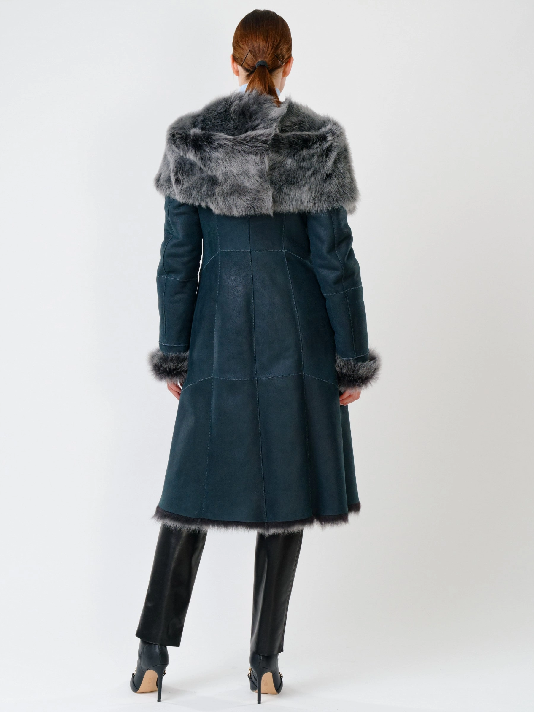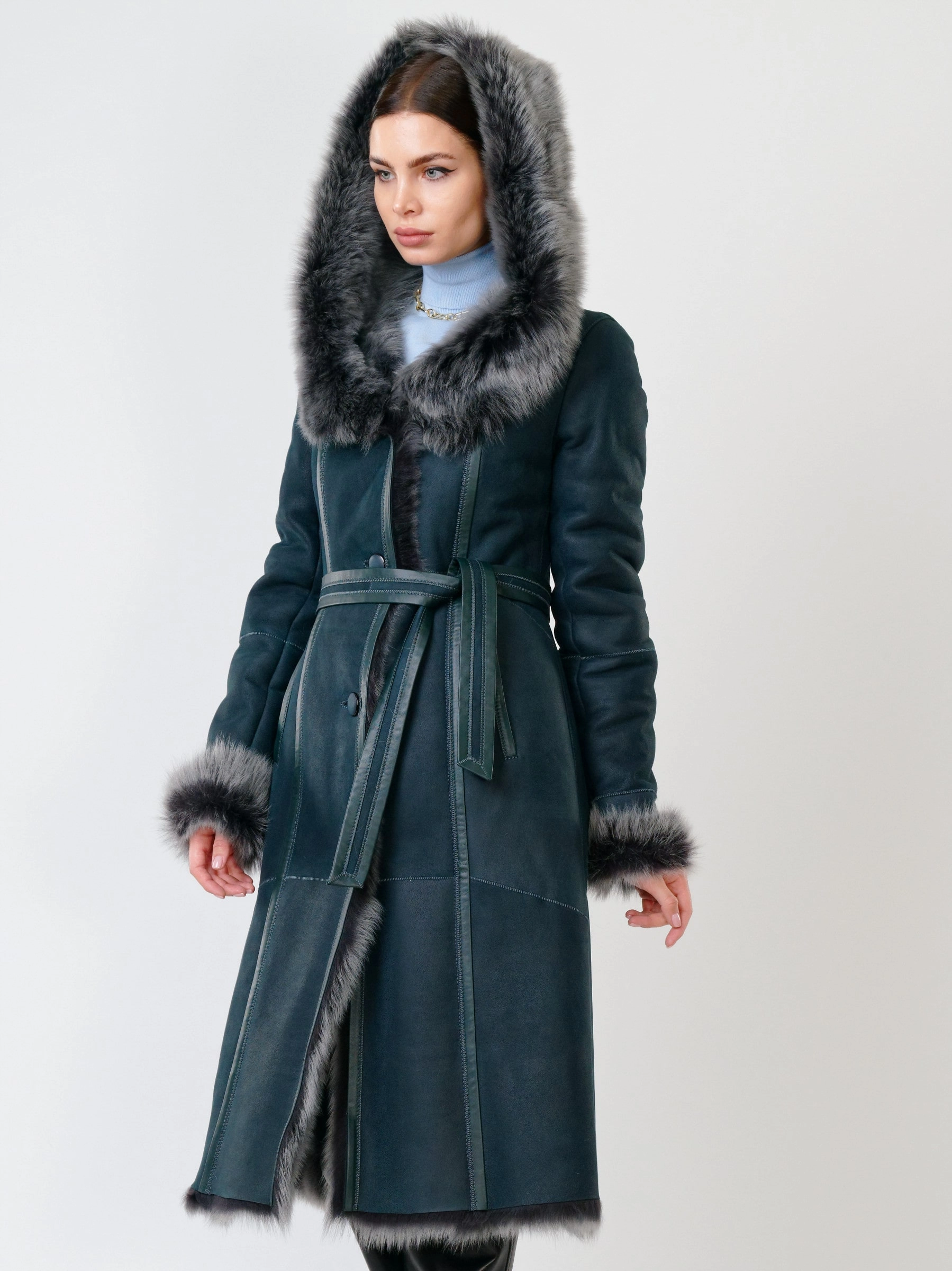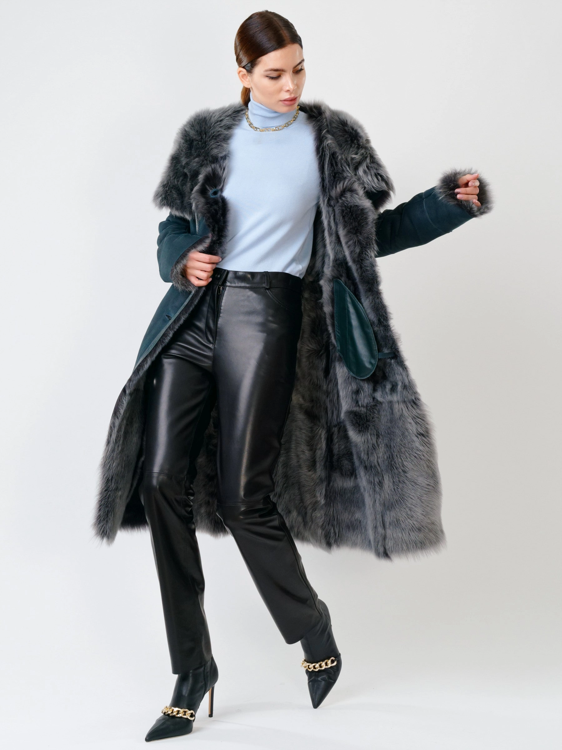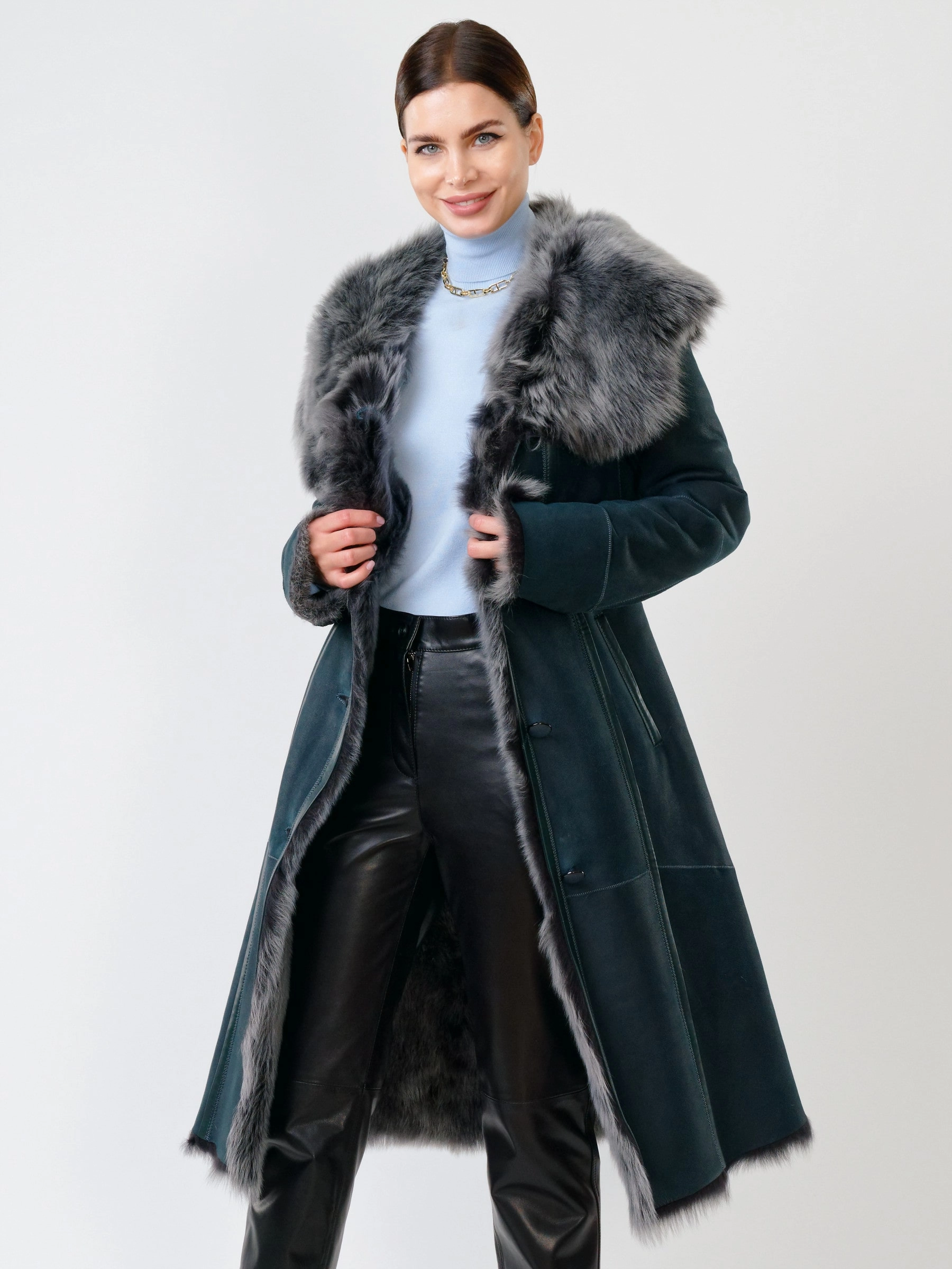 Прекрасная дубленка из тосканской овчины сумеет противостоять любым морозам. Модель получилась легкой и теплой. Отличным дополнением к образу, послужат брюки из натуральной кожи высшего качества. Супер комфорт.