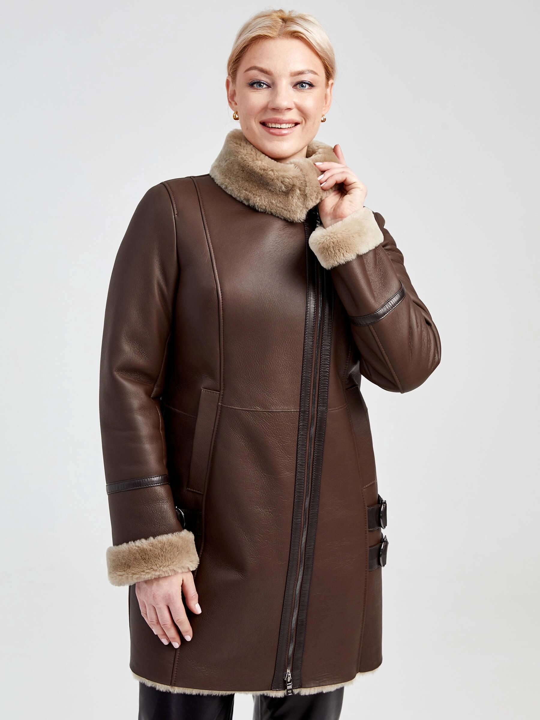Легкая, стильная дубленка прямого силуэта с отложным воротником застегивается двумя широкими ремешками с пряжками. Модель из мягкой матовой овчины, окрашенной в сдержанный коричневый цвет. Лаконичный вид изделия позволяет ему органично подстраиваться как под кожаные брюки прямого кроя, так и под джинсы.