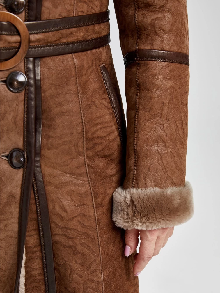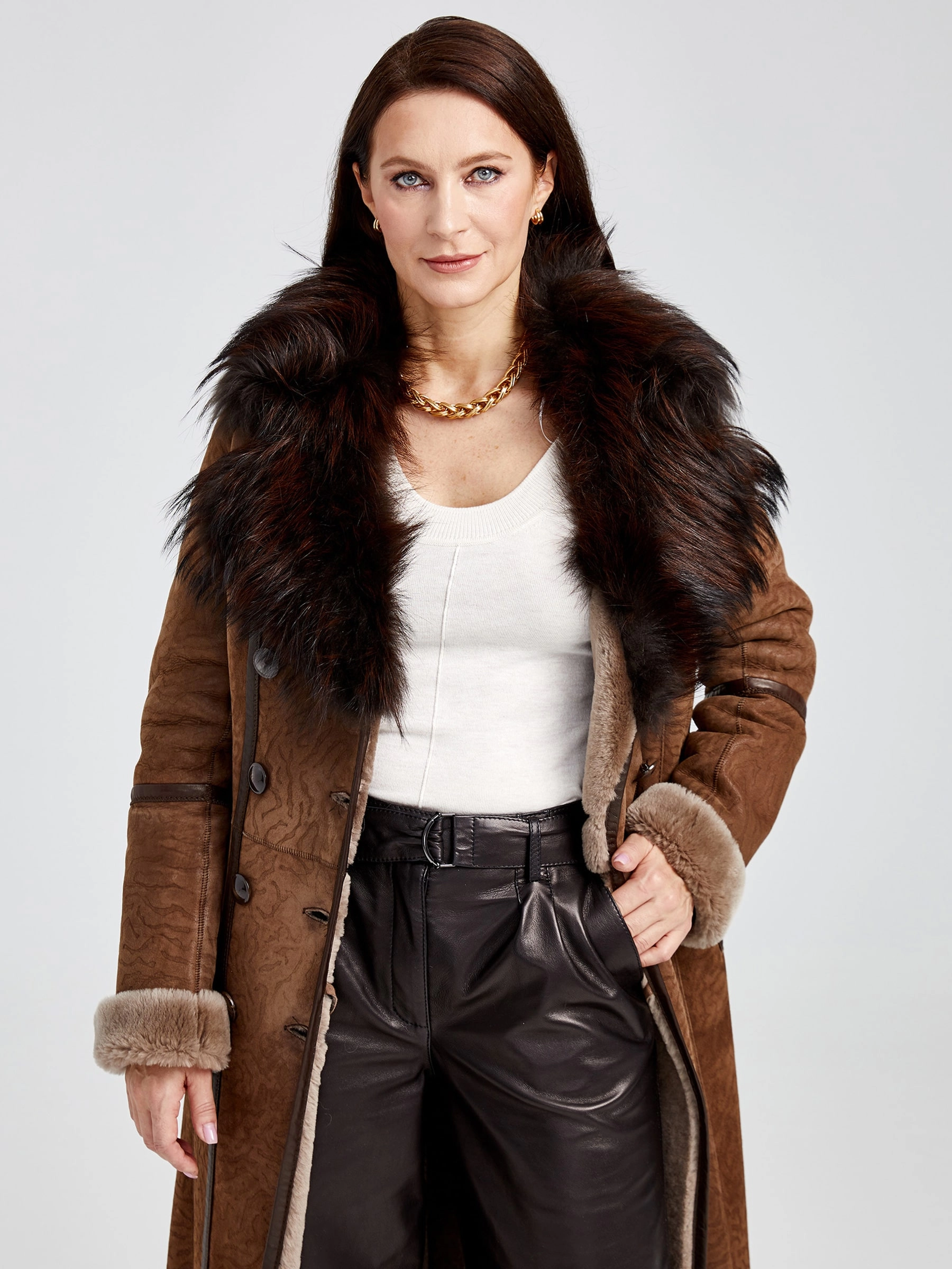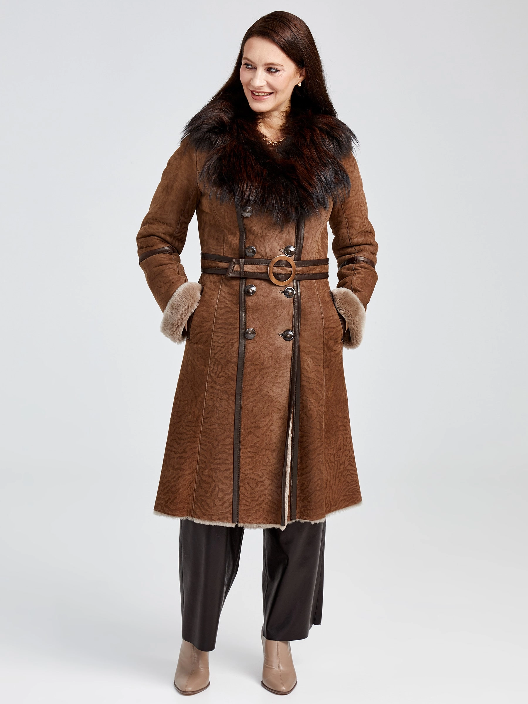 Отличным решением для зимы станет двубортная дубленка из мягкой овчины мерино великолепной выделки. Максимально густой, нежный волос прекрасно согреет в мороз. Модель получилась легкой и теплой. Дополнить образ можно классическими кожаными брюками. Супер комфорт.