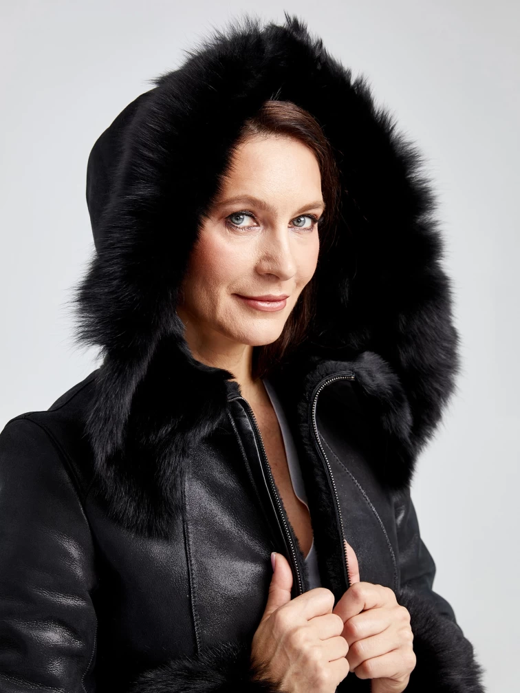 Эффектная молодежная дубленка из овчины с практичным влагоустойчивым покрытием. Оригинальная авторская отделка резинки по линии талии создает идеальный силуэт «песочные часы». Глубокий комфортный капюшон раскладывается в объемный меховой воротник. Завершить образ помогут брюки из натуральной кожи высшего качества.